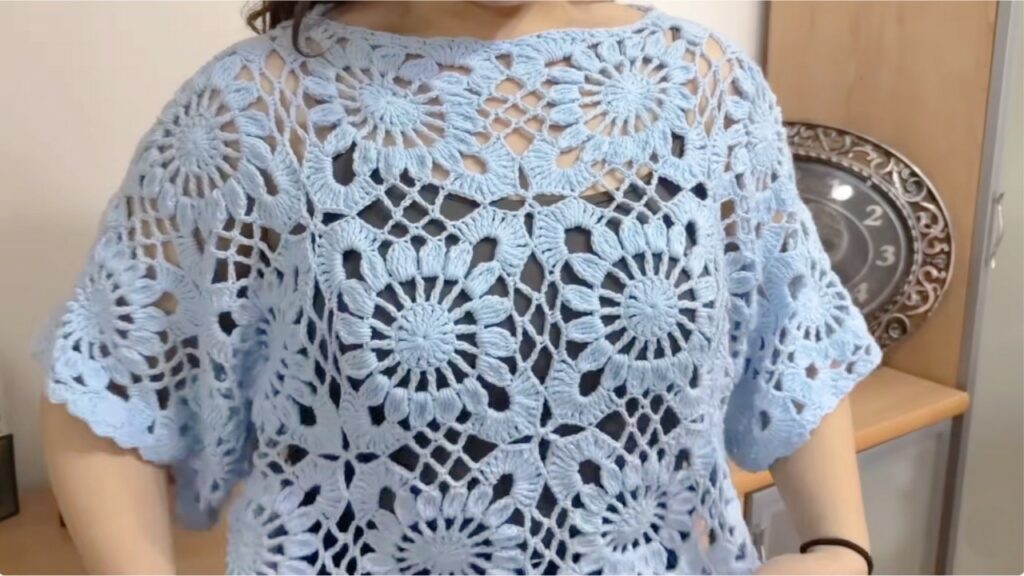 - Sides: join side seams from hem up to where you want the armhole to be, typically leaving ~10–15 cm free (one motif height or so) for a cap sleeve or armhole opening.