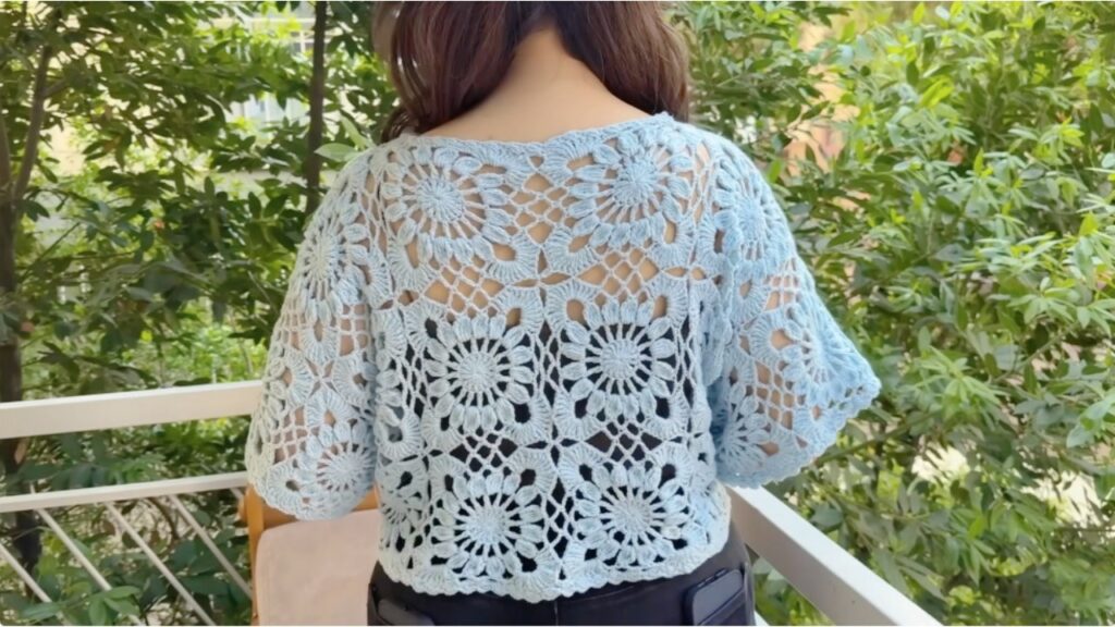 - Join motifs into two panels (front left + front right OR front single + back) according to your layout. Many makers do front-left + front-right (mirror) and one back panel. For simplicity I recommend: make one front panel and one back panel then seam center front if needed.