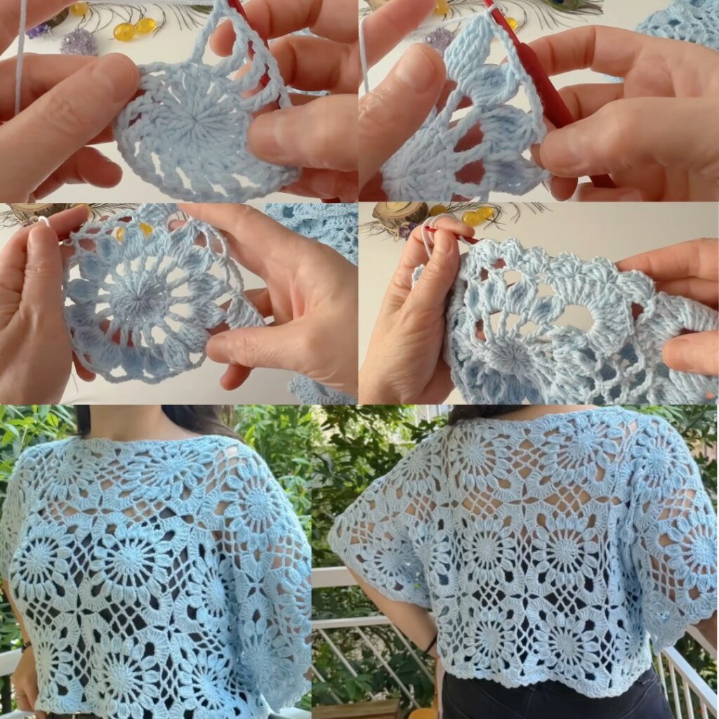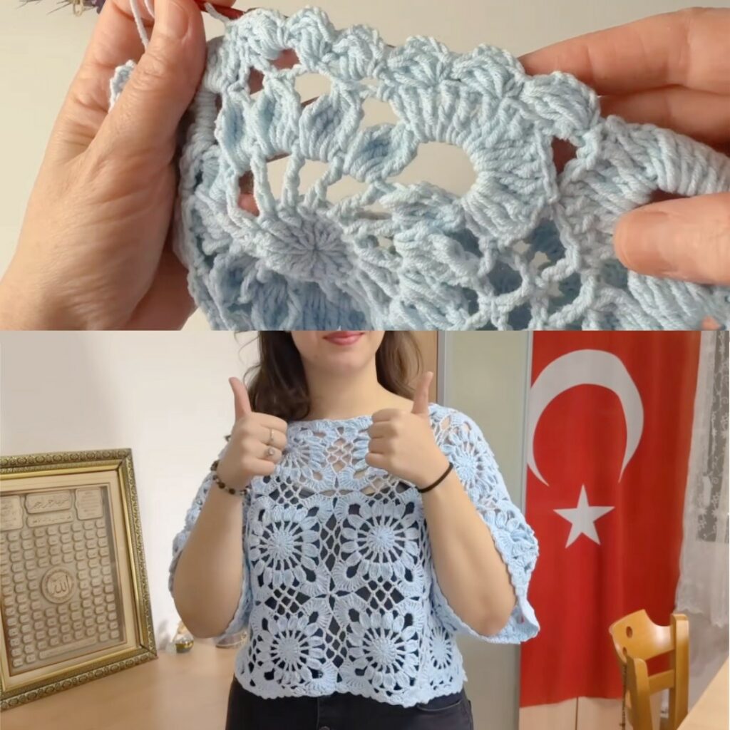Great — below is a clear, ready-to-use step-by-step written tutorial (US terms) that recreates a motif crop blouse in the style of the ÖRGÜ MÜ DEDİNİZ video. It tells you everything you need: materials, an exact hex/square-ish motif worked in rounds, how many motifs for common sizes, blocking, join-as-you-go + sewn joins, finishing, and yarn estimates. Use this while you crochet — no video needed.
