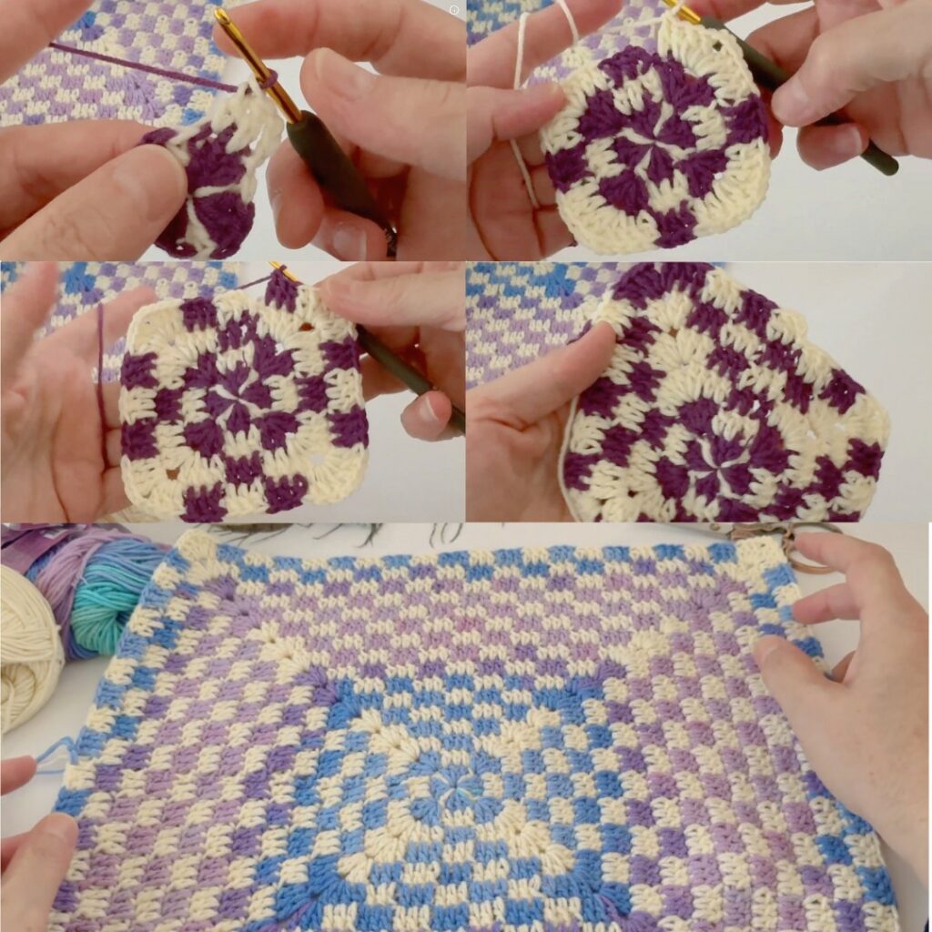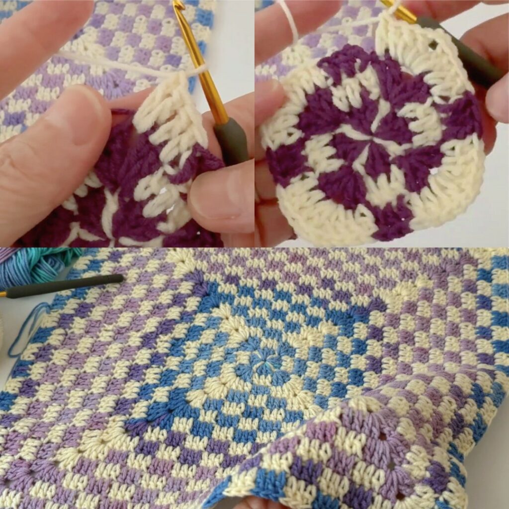 - Block all motifs to identical size and pin in layout. Use mattress stitch through back loops only for a flat seam.