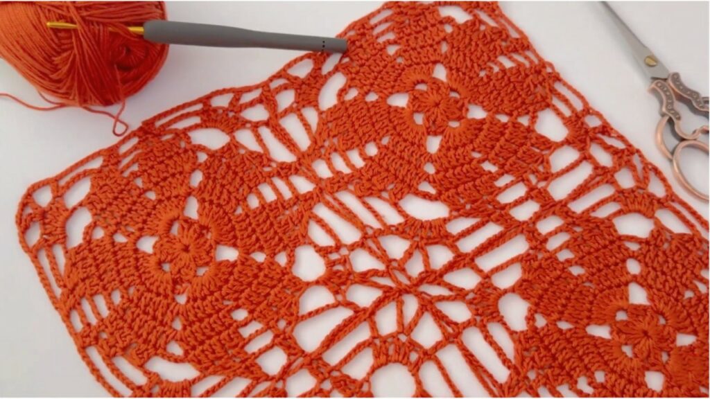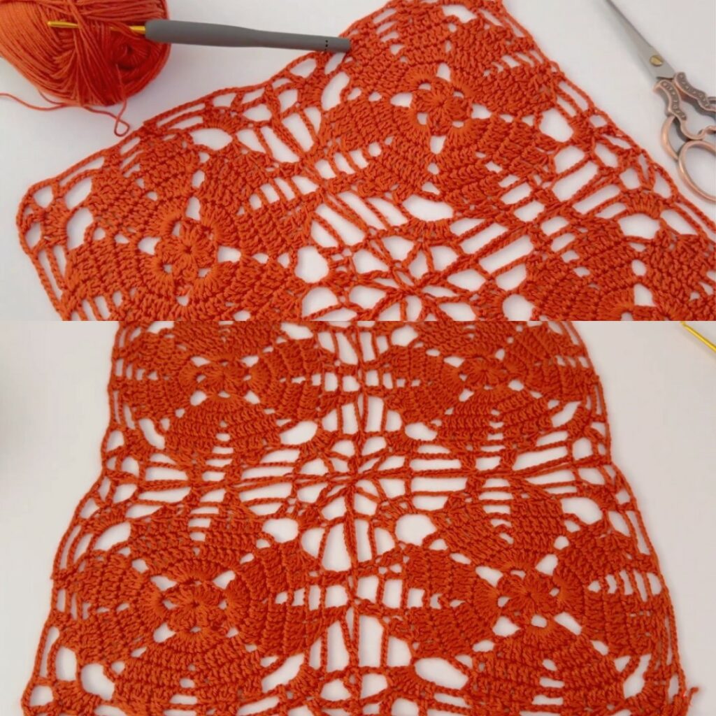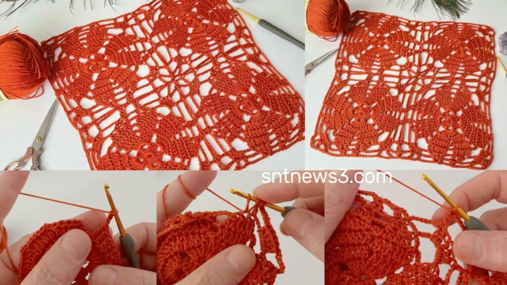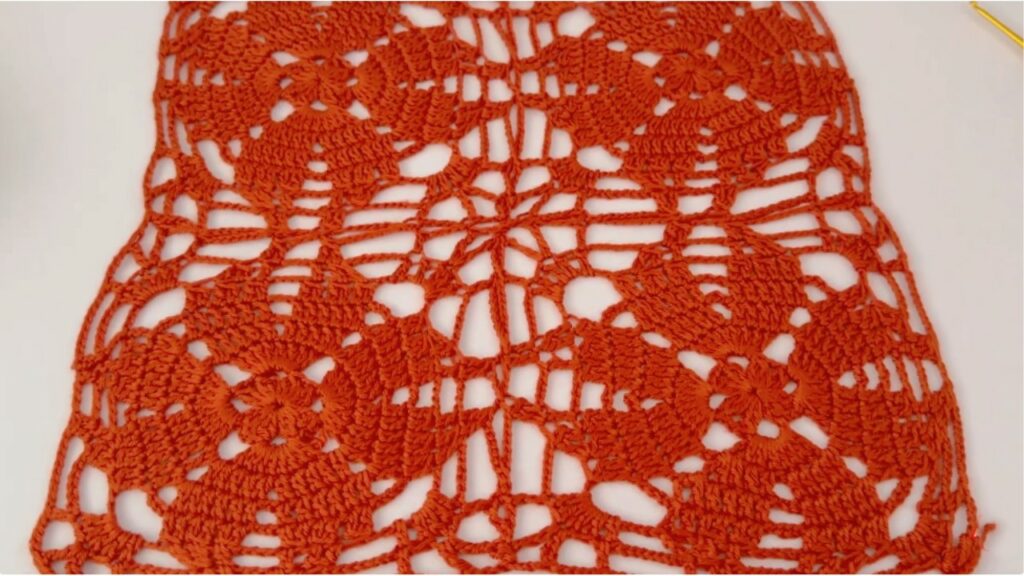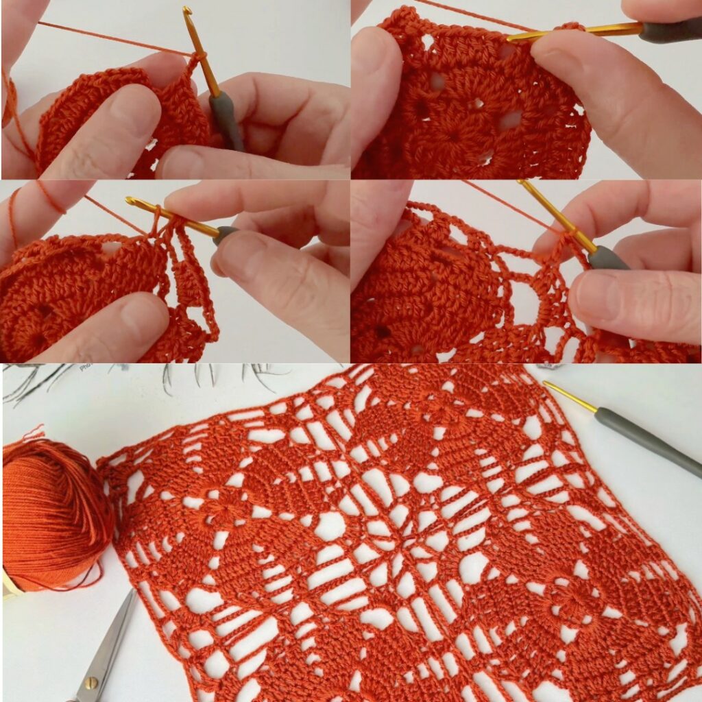- Round design: small center ring → petal/fan rounds → chain arches → a “squareing” round to make a square motif.