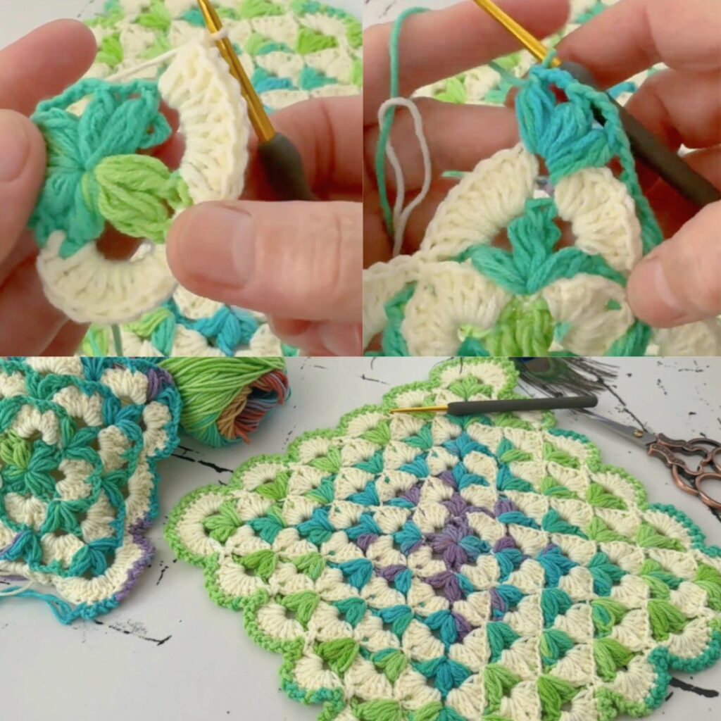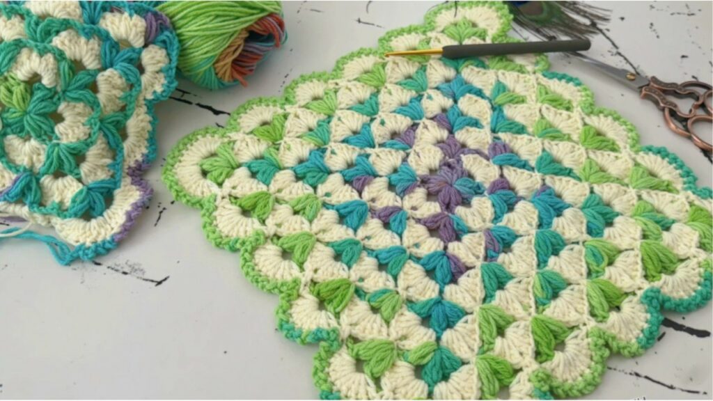 - Round 2: skip 2 sc, 5 dc in next sc (shell), skip 2, sc in next sc — repeat for a scallop finish. Block.