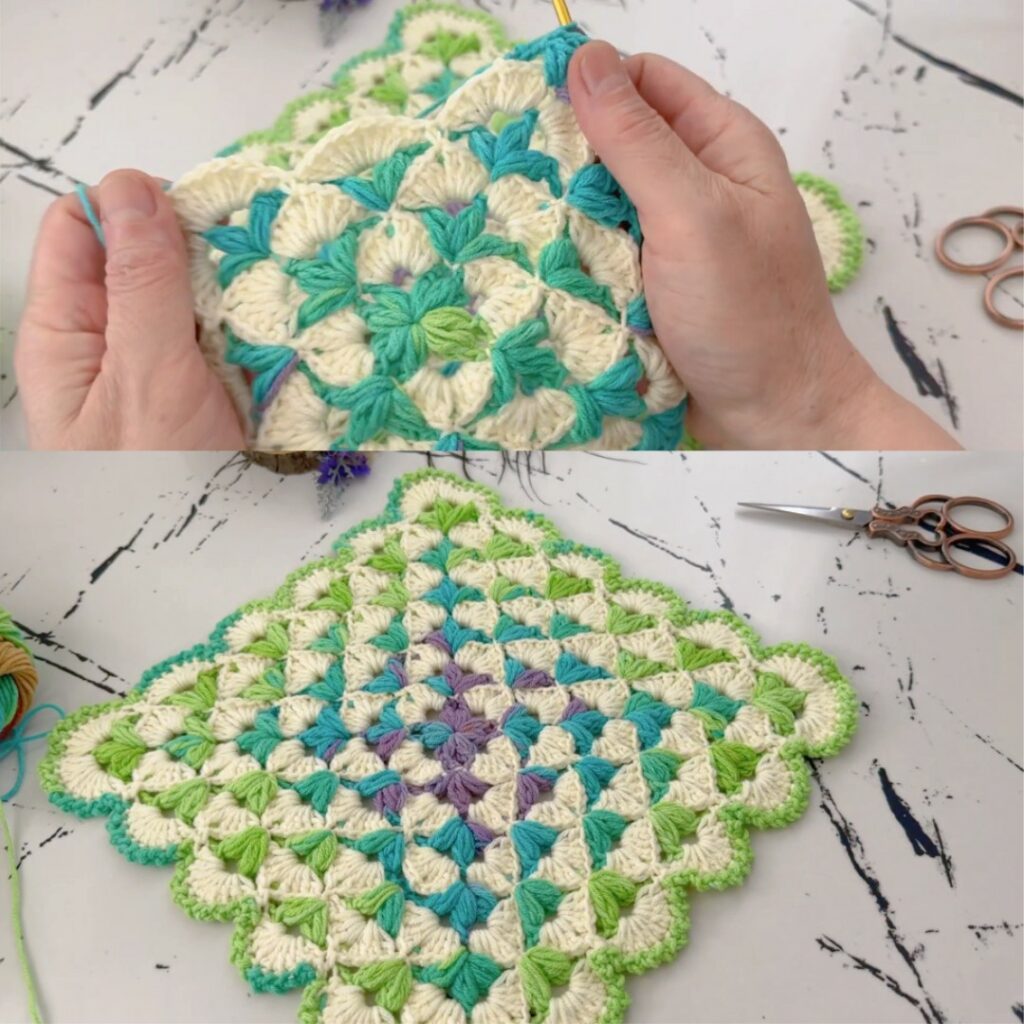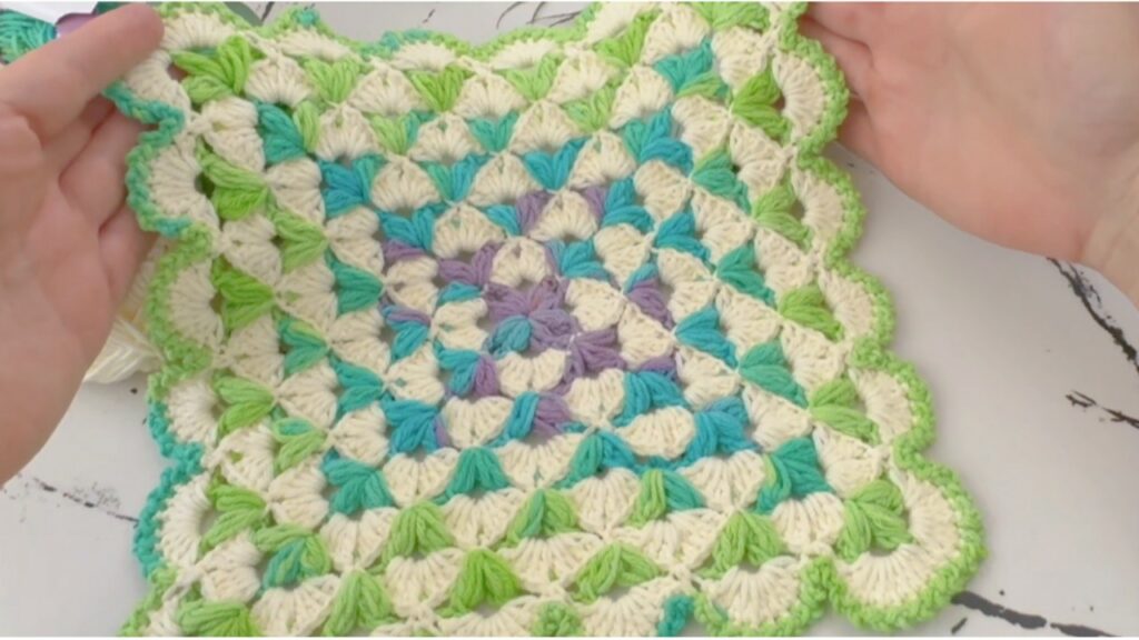 - skip 2 sc, 5 dc in next sc (shell), skip 2 sc, sc in next sc — repeat around for a scalloped edge. Join and fasten off. Block square.