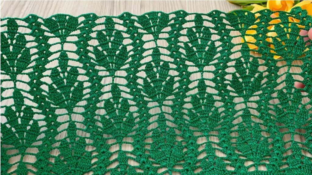 - Work a wide panel (for example 60–70 cm width) and length about 170–200 cm. Add a scalloped border (see below). Block well to open the lace.