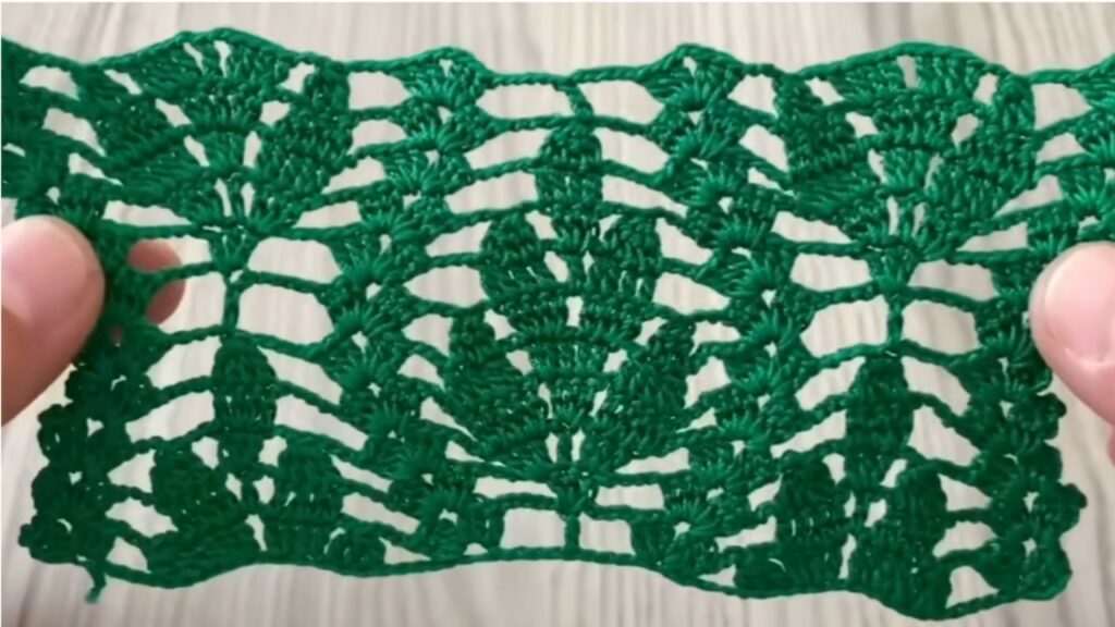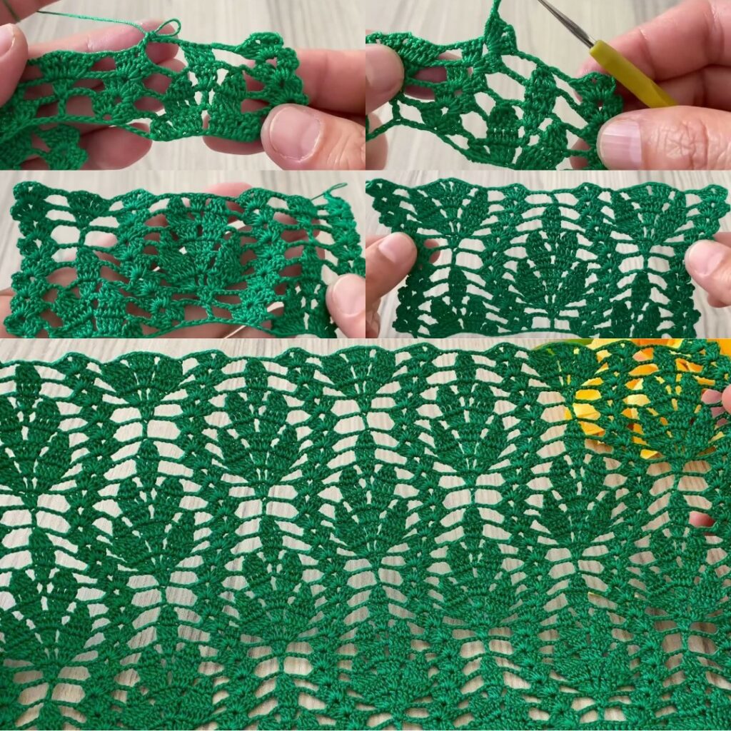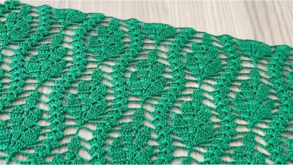 - Row 1 (leaf row): ch3, dc in next dc; sk 2, 5 dc in next st, sk 2, dc in next 2 rep. Turn.