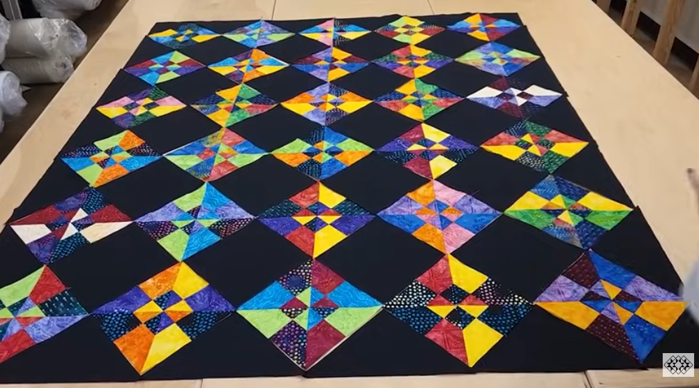 - Arrange your trimmed units into the block configuration shown in the Jordan Fabrics tutorial. For many charm mix patterns that result in the 49″ × 59″ finished top, you’ll create a grid of multiple blocks (the Jordan Fabrics sample is a lap throw with several rows of blocks).