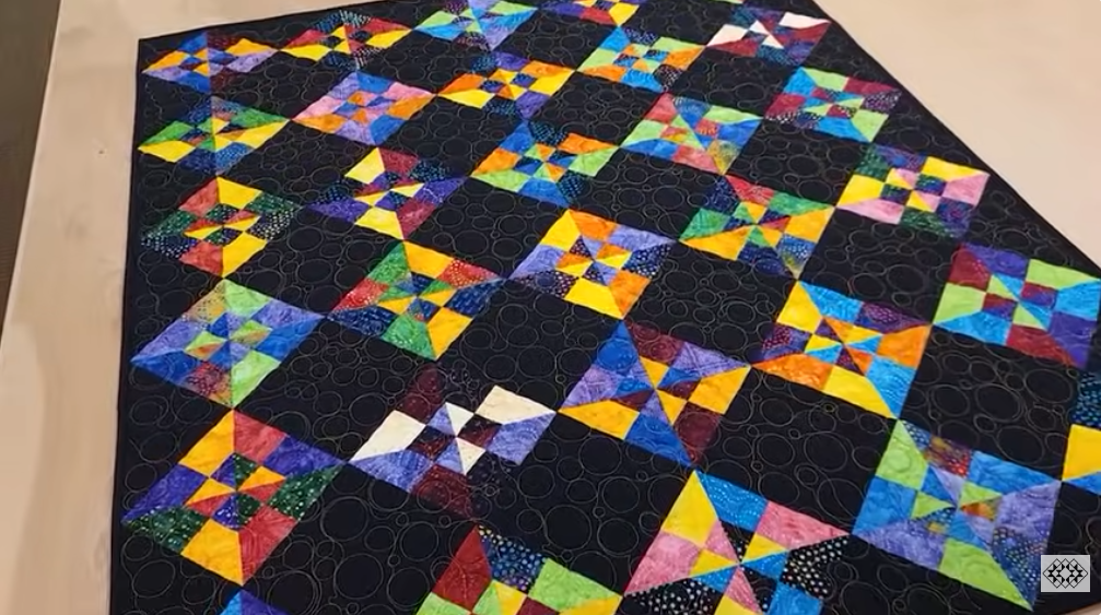 - Main idea: use 5″ charm squares (precuts) to create small patchwork units, “mix” the pieces, then “match” them together into blocks and set those blocks on a darker background so the secondary pattern pops.