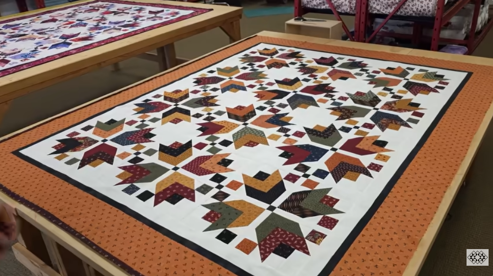 - Lay out the trimmed blocks in the on-point layout on your design wall, adding side triangles and corner triangles to create the outer shape. Assemble in manageable rows (partial rows at edges). Sew blocks into rows, press, then join rows to build the full quilt top. The video shows the satisfying progress as the “harvest field” pattern emerges when blocks are placed and turned on point.