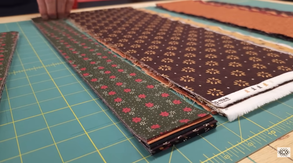 - From the long strip sets, sub-cut the lengths called for in the pattern (commonly repeated widths such as 2½”, 5″, or other multiples). The video demonstrates cutting sub-units that then become block components — keep pieces grouped so assembly is fast.