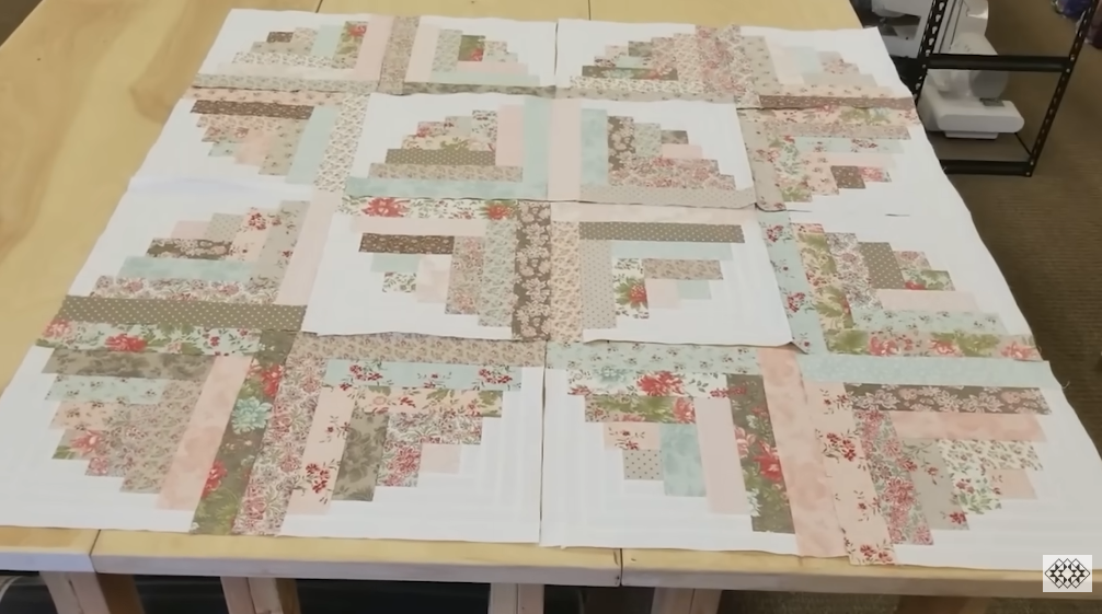 - Lay out all trimmed blocks on a design wall or floor. The Curvy Log Cabin effect is achieved by: