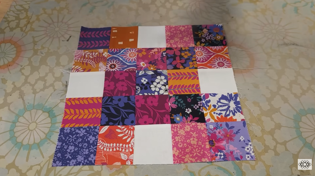 - Lay out all trimmed blocks on a design wall or floor. Shuffle blocks until the overall distribution of color/value reads balanced — step back often to see how the chains flow across the field. The video shows several layout adjustments to get an even read.