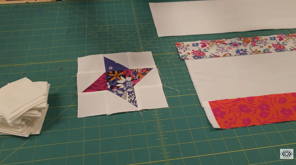 - Where the pattern calls for half-square triangles or corner background pieces, make those now (HSTs or flying-geese made with squares cut on the diagonal are common). The video shows making small HSTs in batches and trimming them to size.