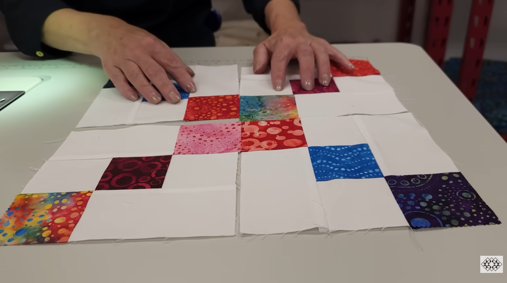 - On a design wall or the floor, lay out all trimmed blocks in the grid the pattern shows. Shuffle units until color/value balance is even across the top — step back and view from a distance to catch hotspots. The Jordan Fabrics video shows Matt and Donna adjusting blocks for even color flow.