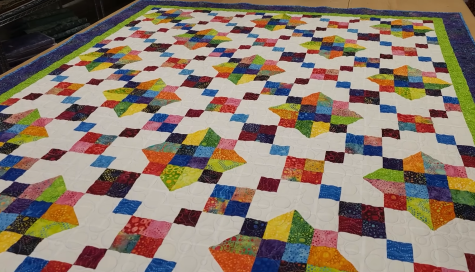 - All-over meander for cozy texture that won’t compete with the busy patchwork.
