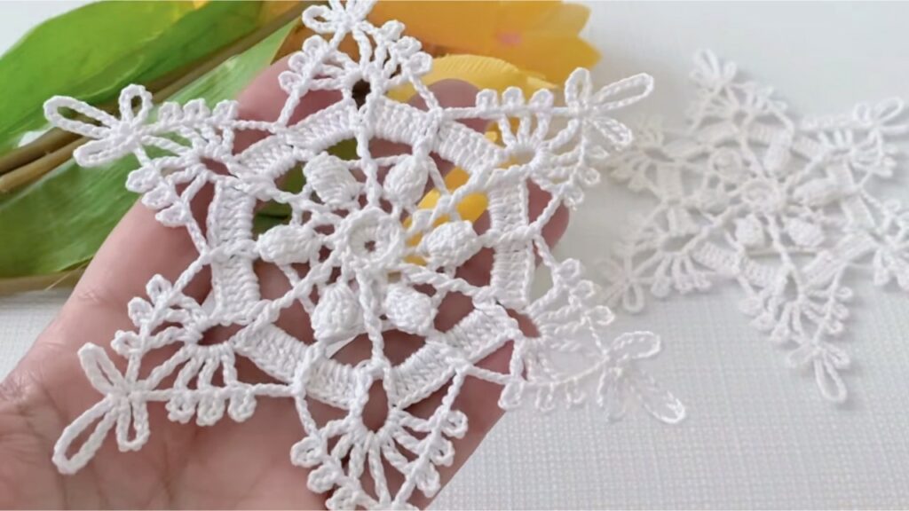- If the snowflake sags (arches droop): shorten arch chains by 1 or 2 (ch-7 instead of ch-9) or add one more rib in Round 6 to stiffen.