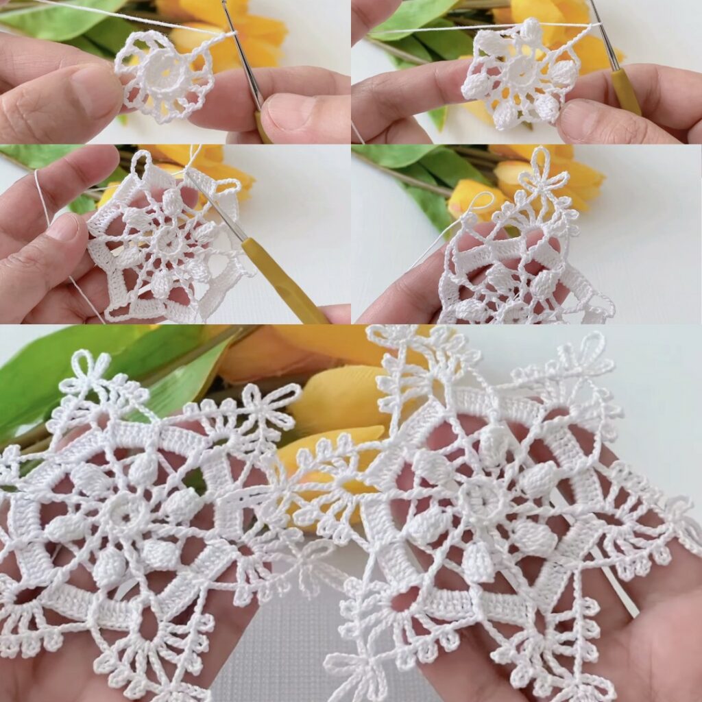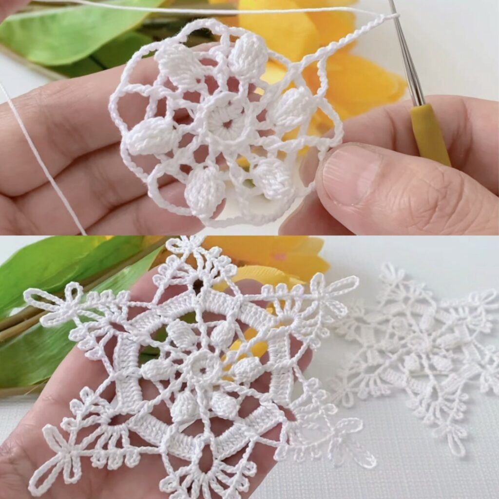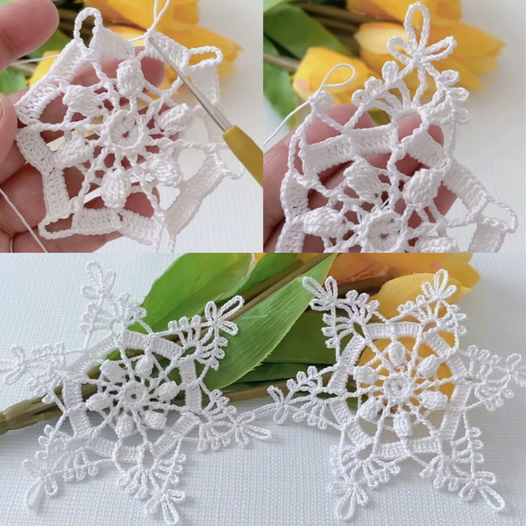 - We’ll make small decorative spikes and picots around the outer chain arches to get that snowflake sparkle.