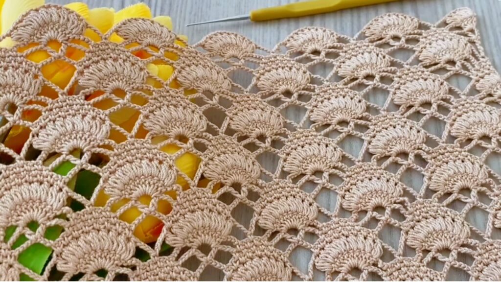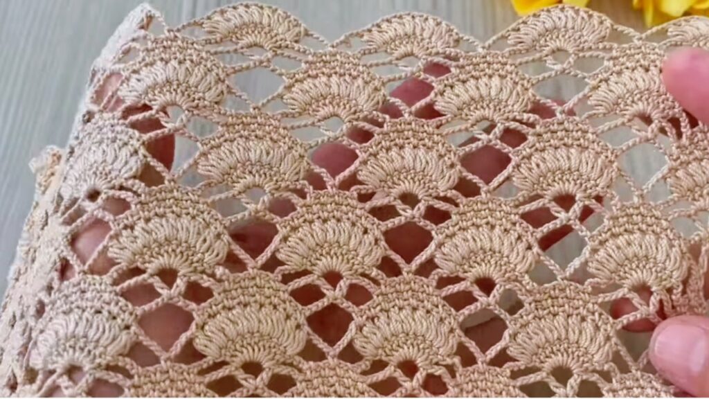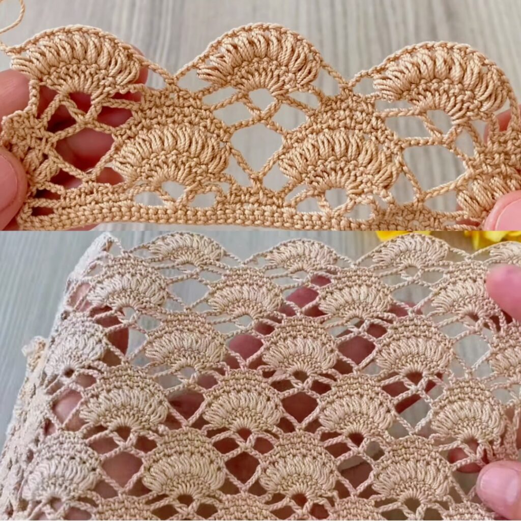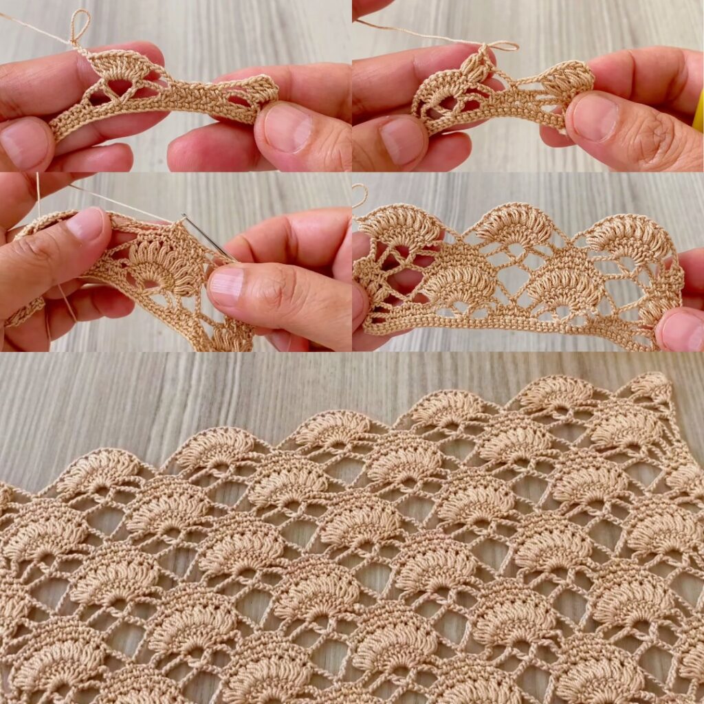Rectangular shawl: join motifs into a rectangle (e.g., 6 × 10 motifs). Add a final scallop border (2 rounds sc + shell/picot round).