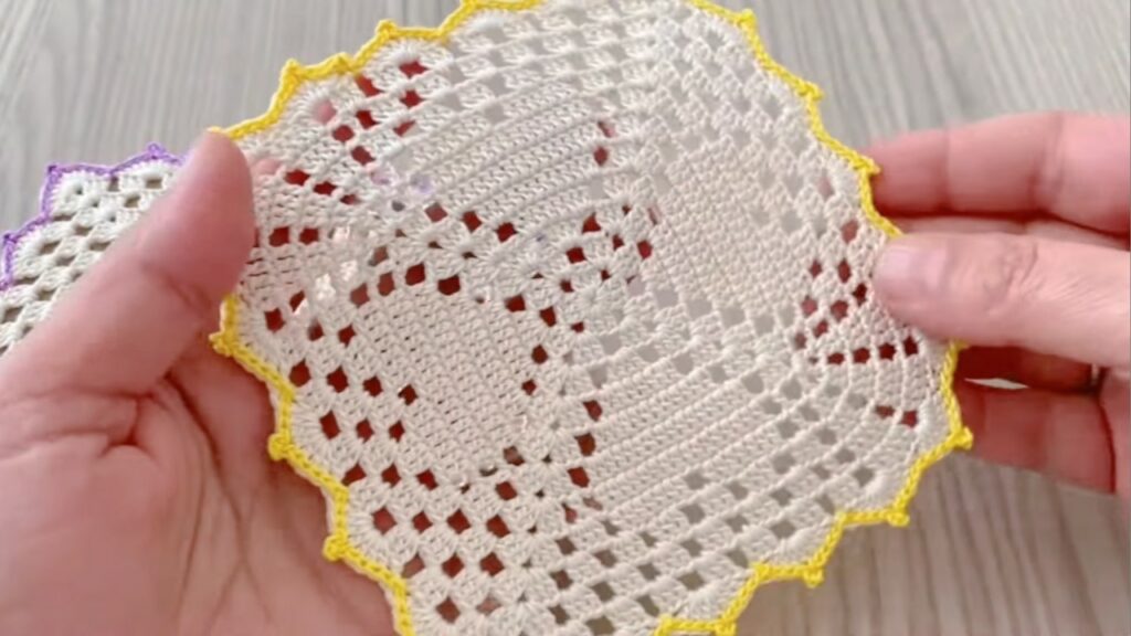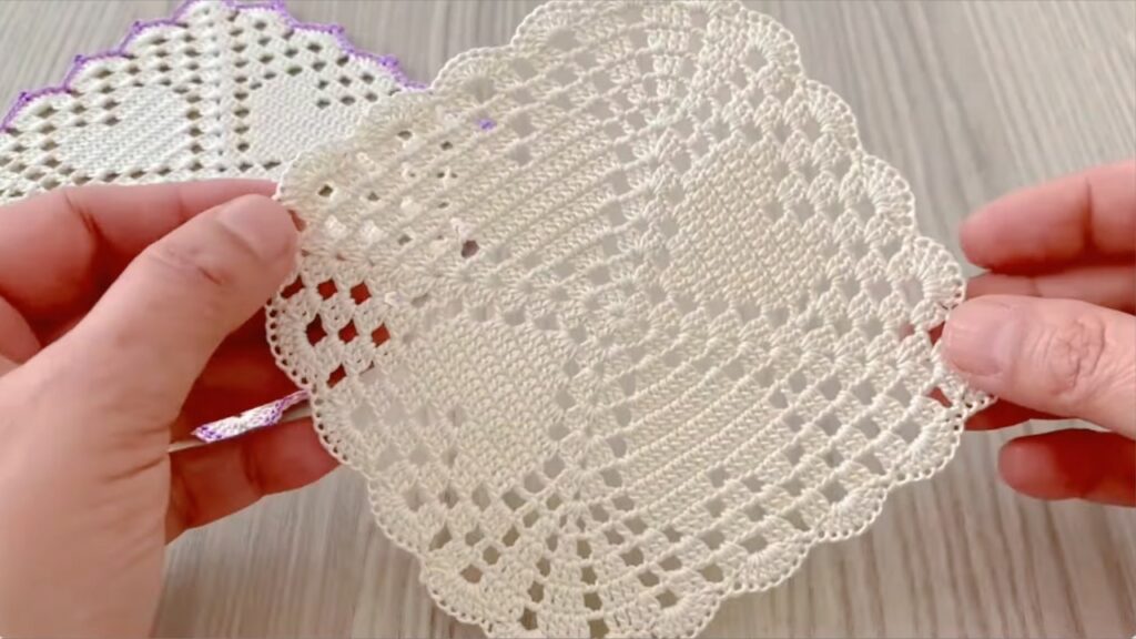 - Crochet the first square fully. For each new square make rounds 1–7 then begin Round 8. Whenever you reach a scallop/picot that corresponds to a finished neighbour, sl st into the corresponding stitch/picot of the finished motif instead of making that picot. Attach at side loops and corner loops. JAYG yields tidy, nearly invisible joins and minimal sewing.