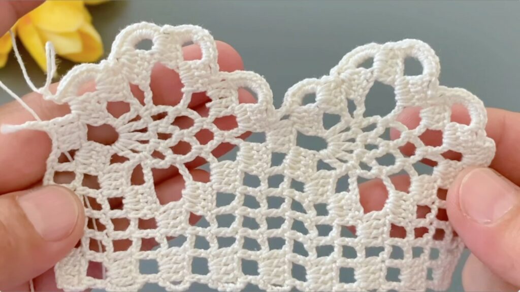 - This edge is worked from a tidy sc base row into little ch-loops, then each loop is filled with a pointed leaf cluster and finished with a picot dotted scallop.