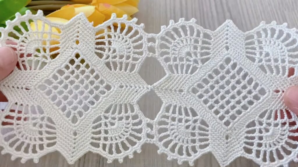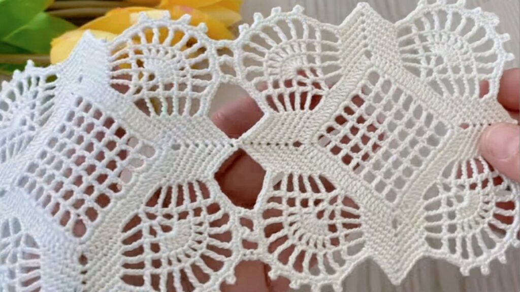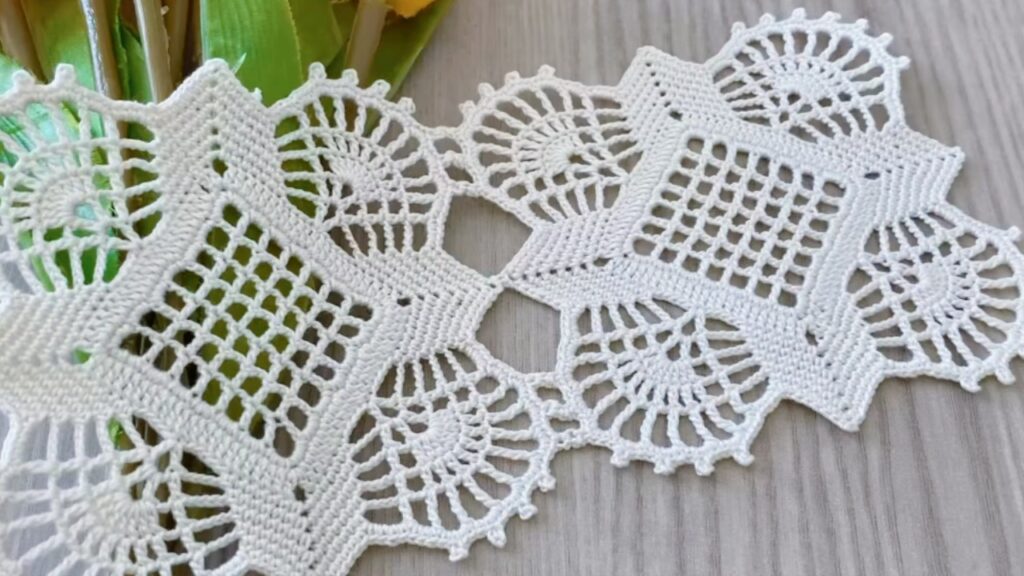 - Rejoin and work a delicate scalloped/picot edge around the outside. Example repeat: sc 3, (pic: ch 3, sl st into same st), sc 4 across each small side section — tweak counts to make scallops lie flat.