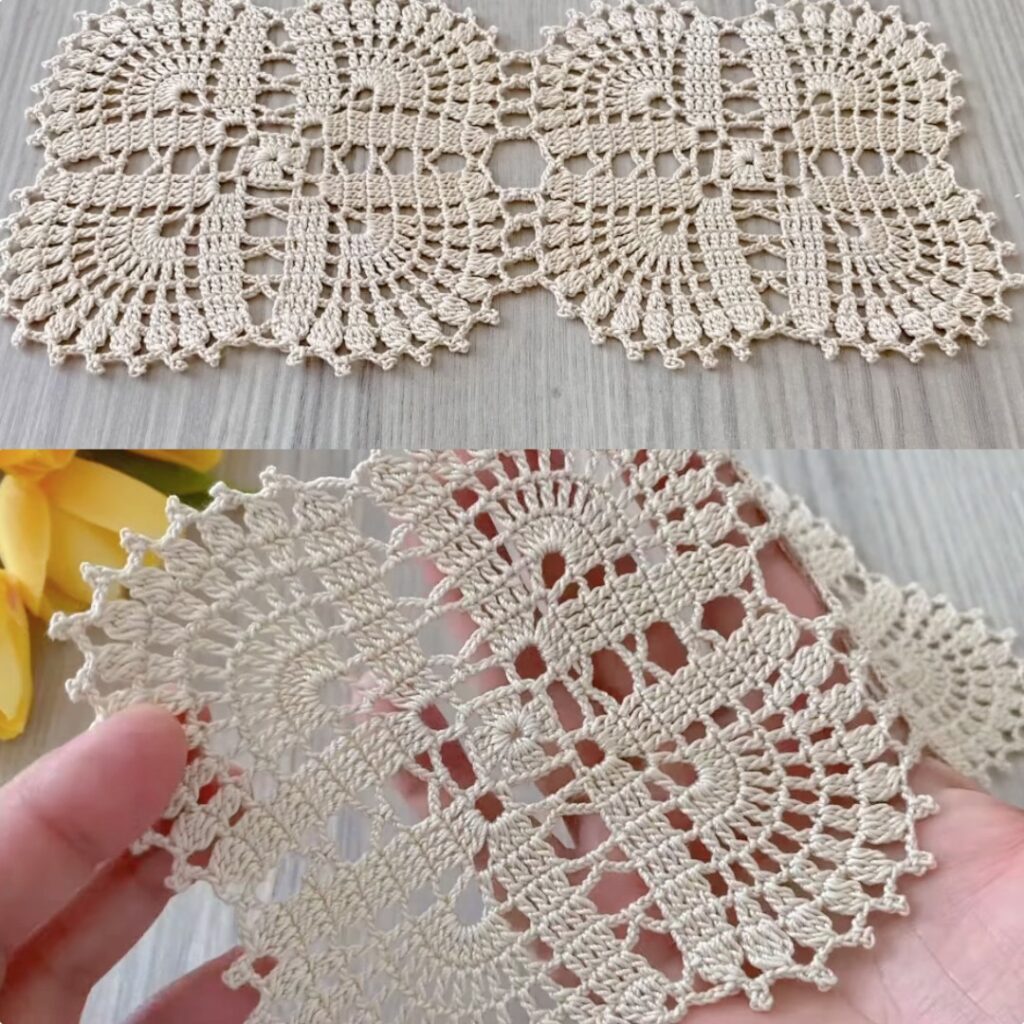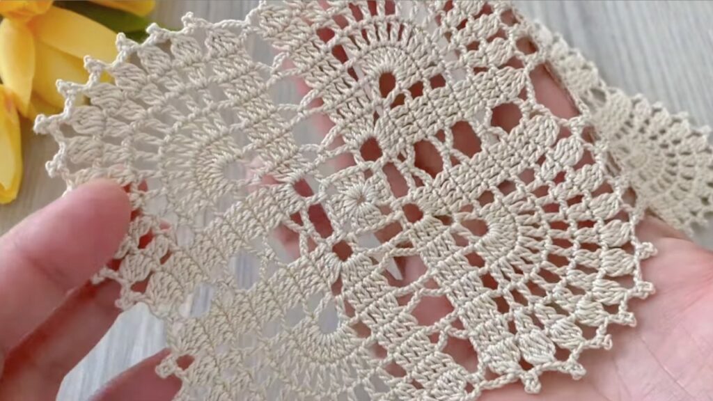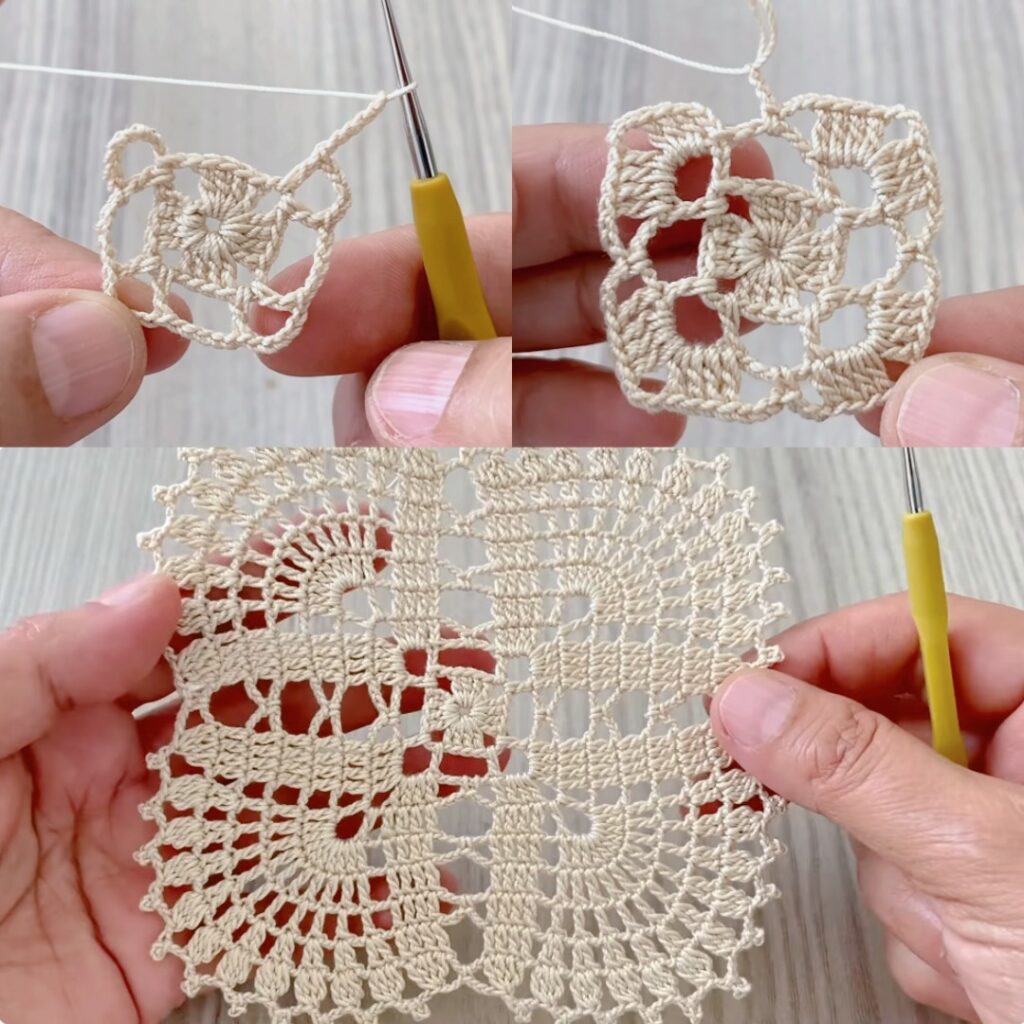This motif is worked in rounds, starts from a center circle, and gradually forms a soft, elegant lace square suitable for many projects.