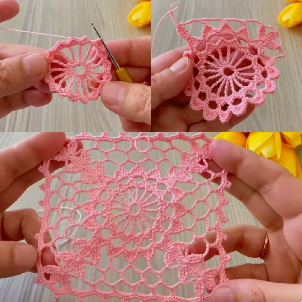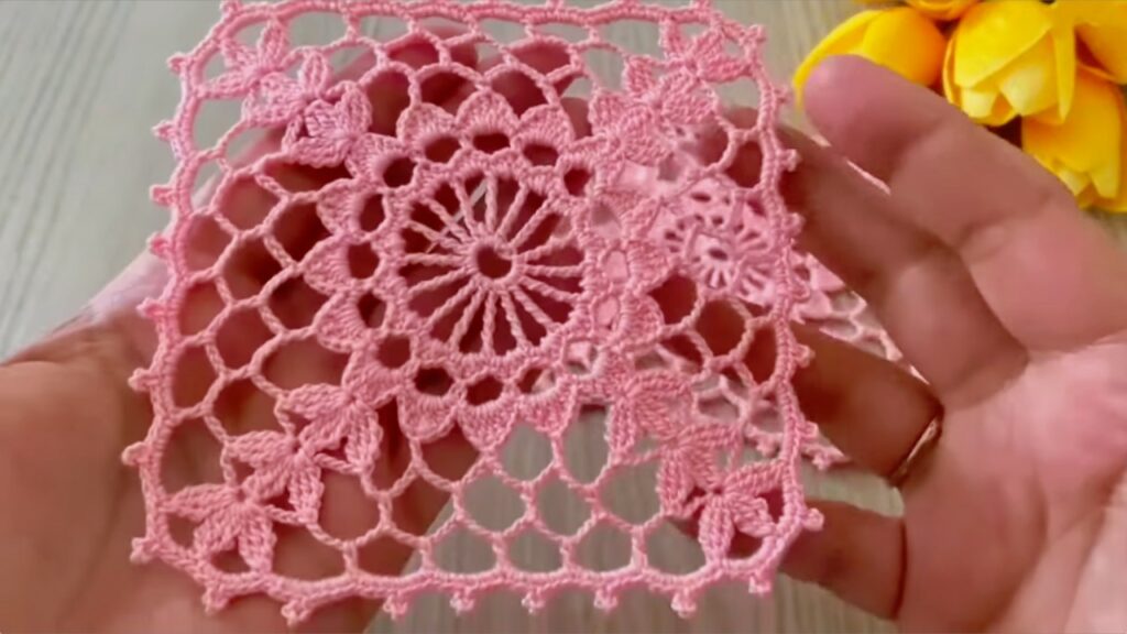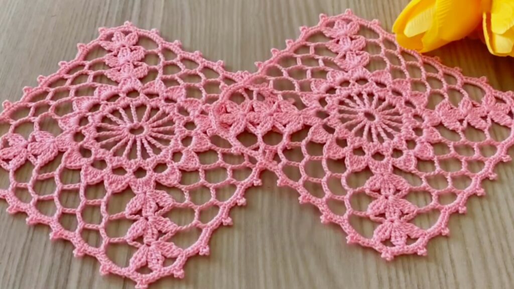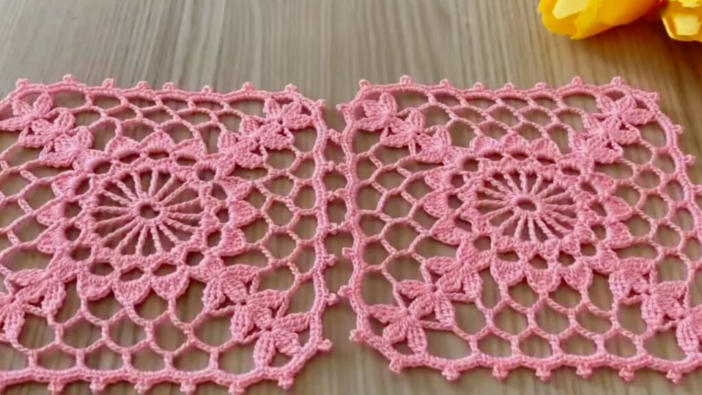- In next corner space: (2 dc, ch 2, 2 dc)*