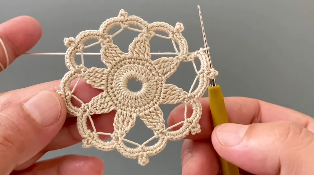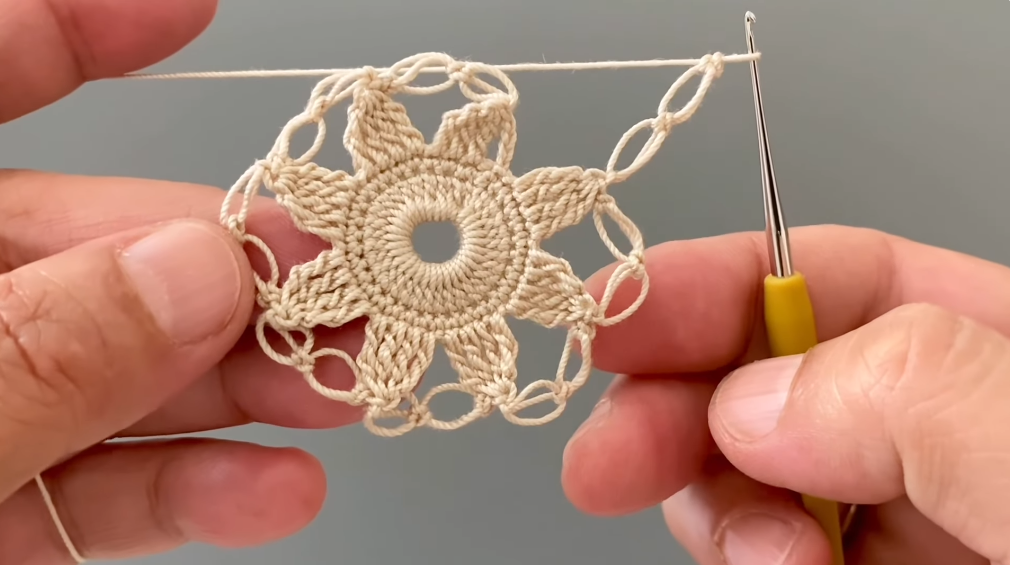 - Sl st to the center of a petal.