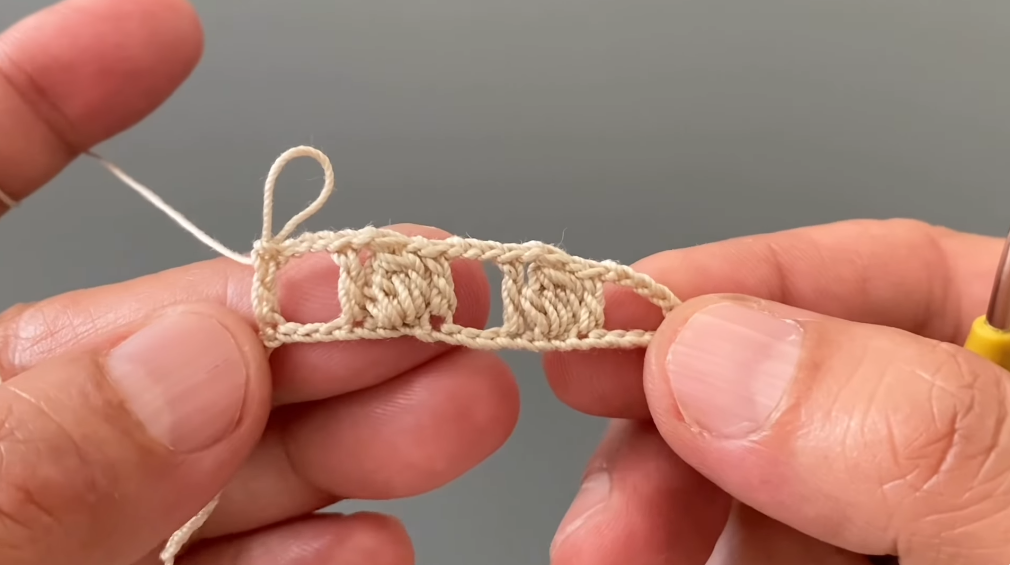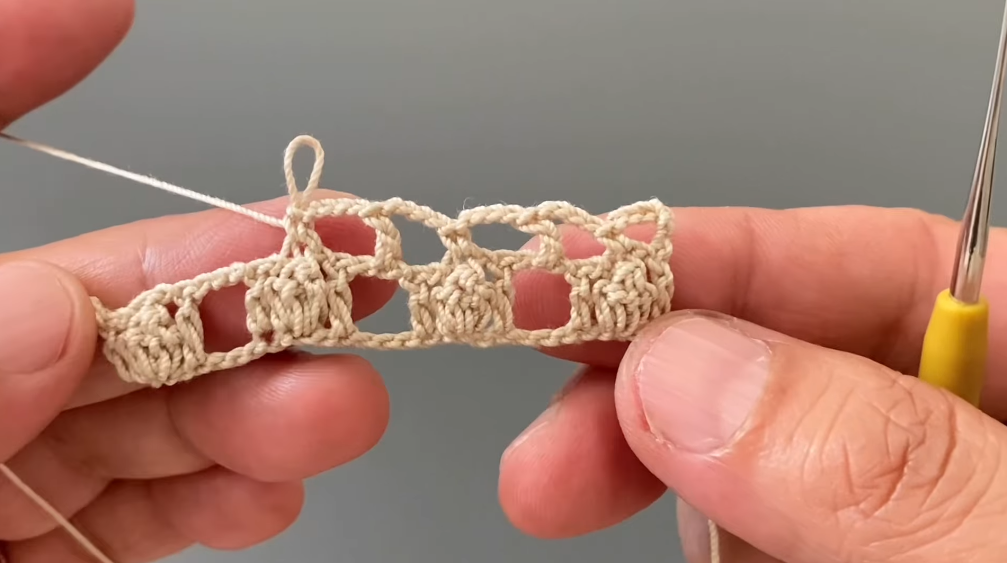 - Repeat (ch 2, skip 2, 2 dc, ch 2, skip 2, sc) across