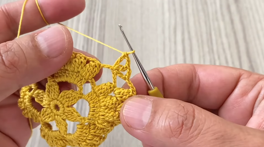 - Sl st into first ch-4 space.