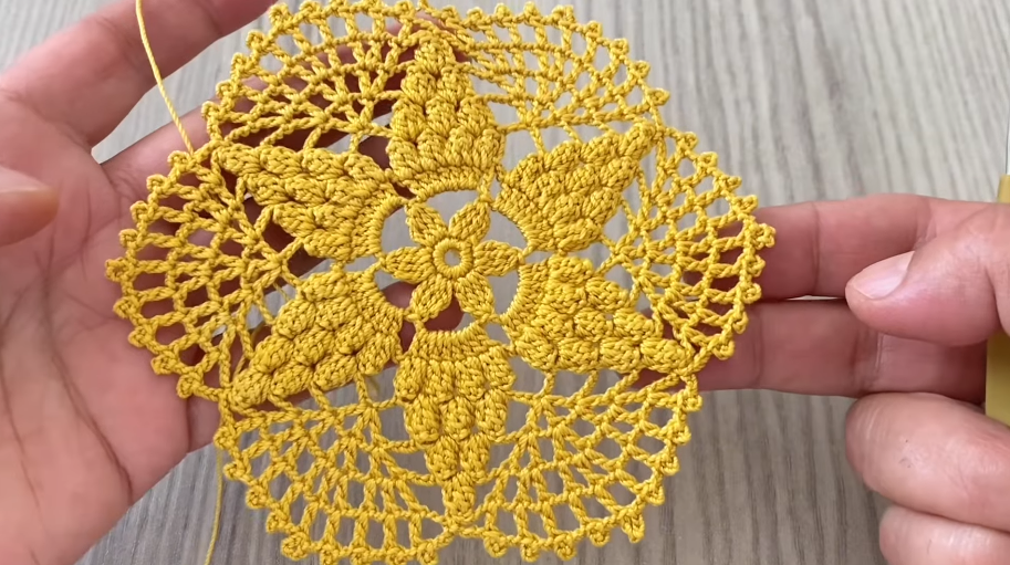 - Repeat (skip 1, sc, ch 5) around entire circle.