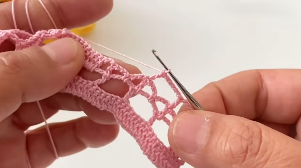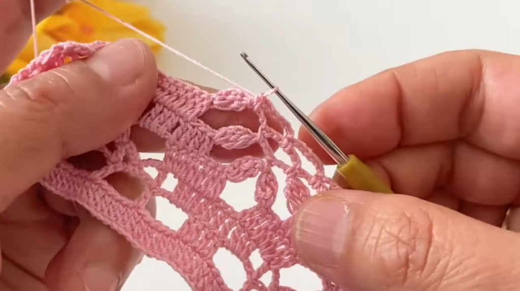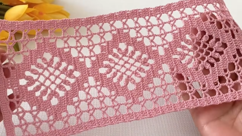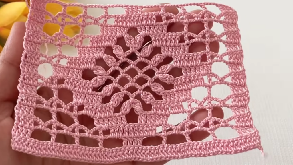 Because it uses simple repeating rows of chain arches and shells, the pattern is beginner-friendly while still producing a decorative lace texture.