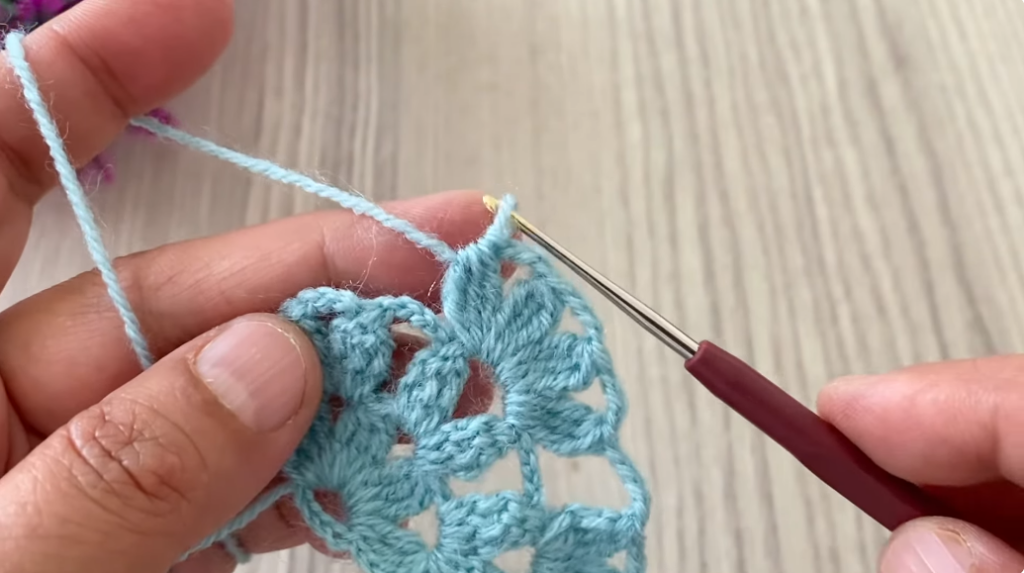 👉 You now form clusters of treble stitches