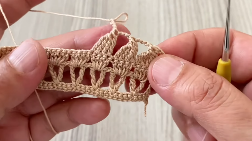 - Uses chains + double crochet groups (cluster/fan style)