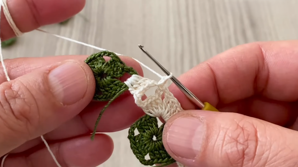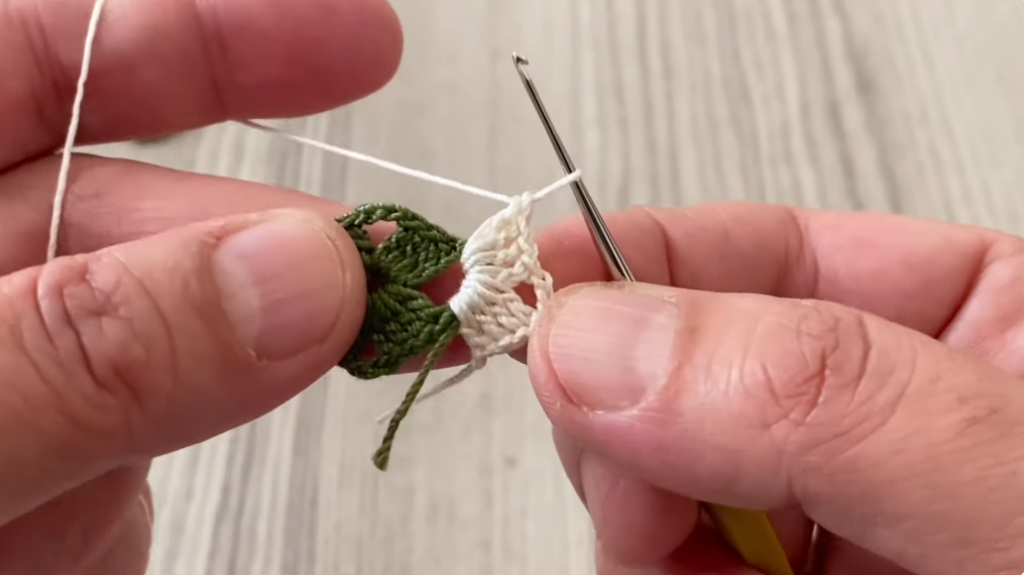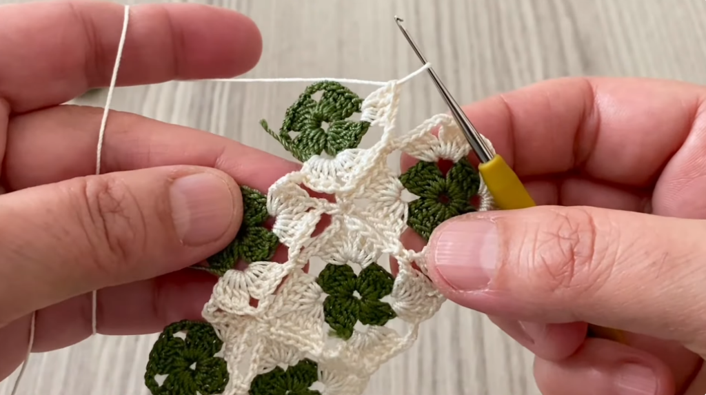 - Row 3: 2 dc in spaces (new color)