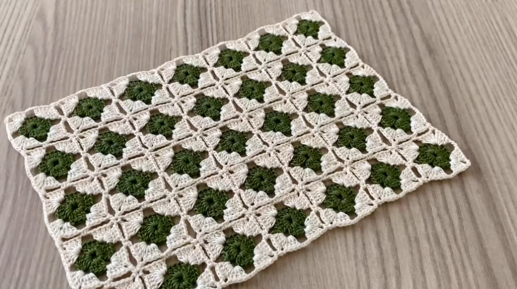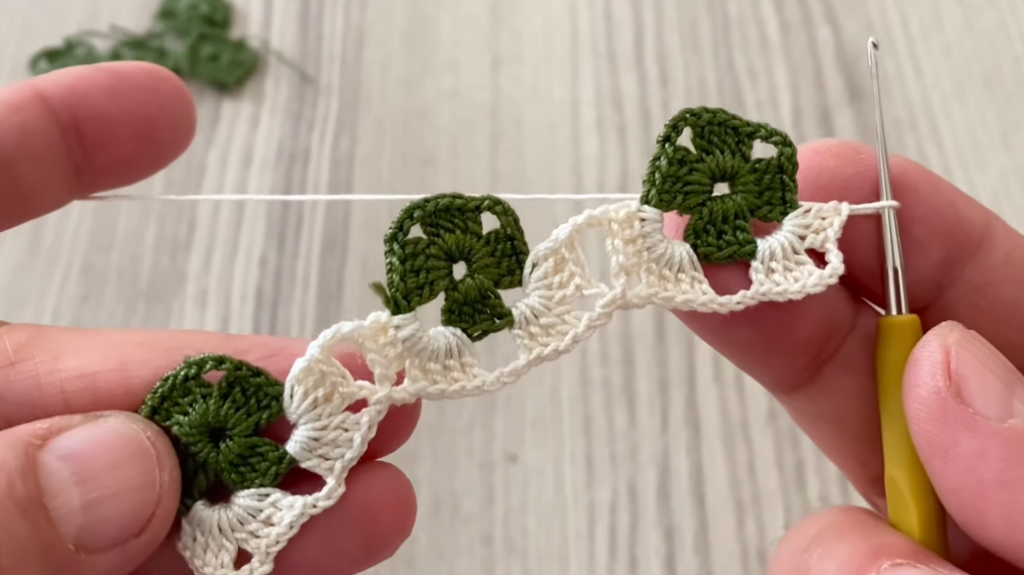- Row 2: dc + ch (spaces)
