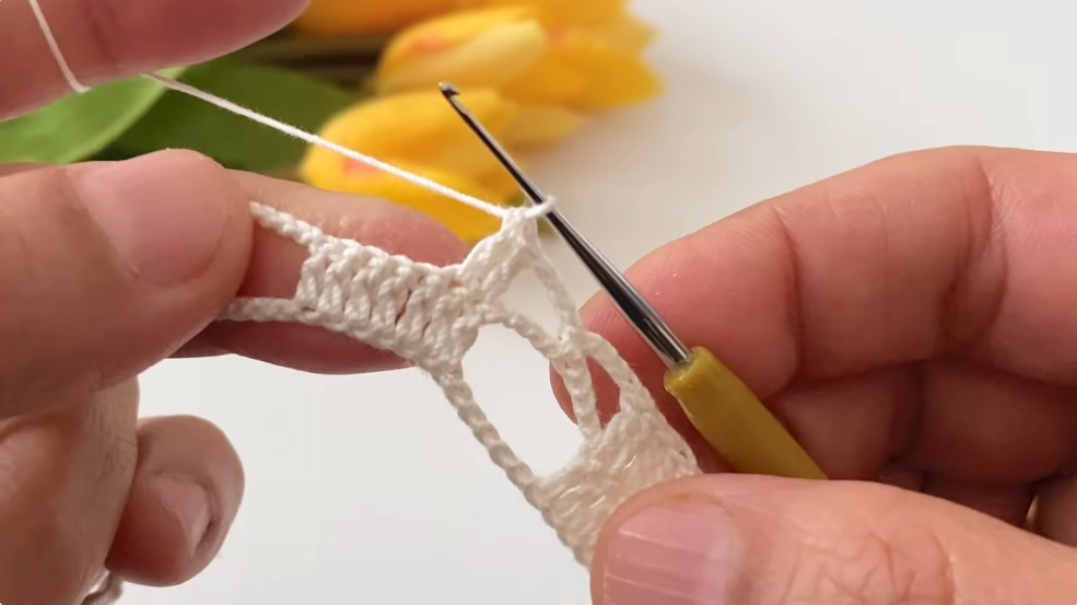 - Into each chain space (ch-1 sp) work:
