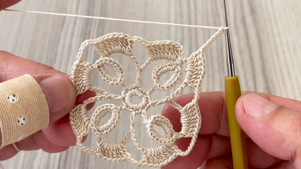 👉 The square shape is formed by creating corners (dc, ch 2, dc) evenly in the round