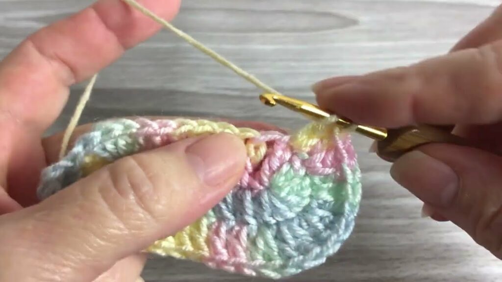 We begin by crocheting a flat oval that forms the bottom of the bootie.