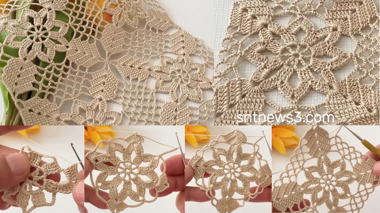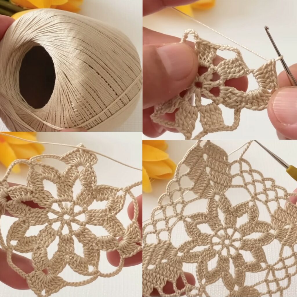 - Then you’ll work the first motif units: for example, chain a certain number, skip chains, make a cluster or shell, chain again, etc. (Since I don’t know the exact motif from the video, I’ll give you a motif version you can follow and adapt).