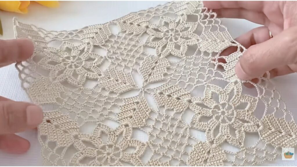The motif is a repeated unit built around chains and shell/cluster stitches. The video shows how you can repeat the motif across a piece to make a flat fabric, and you can adapt it into a runner, blouse, or other shape. The repeat is versatile — you’ll establish a foundation row of motifs, then continue rows repeating the motif pattern.