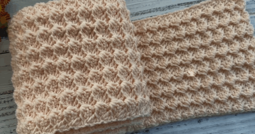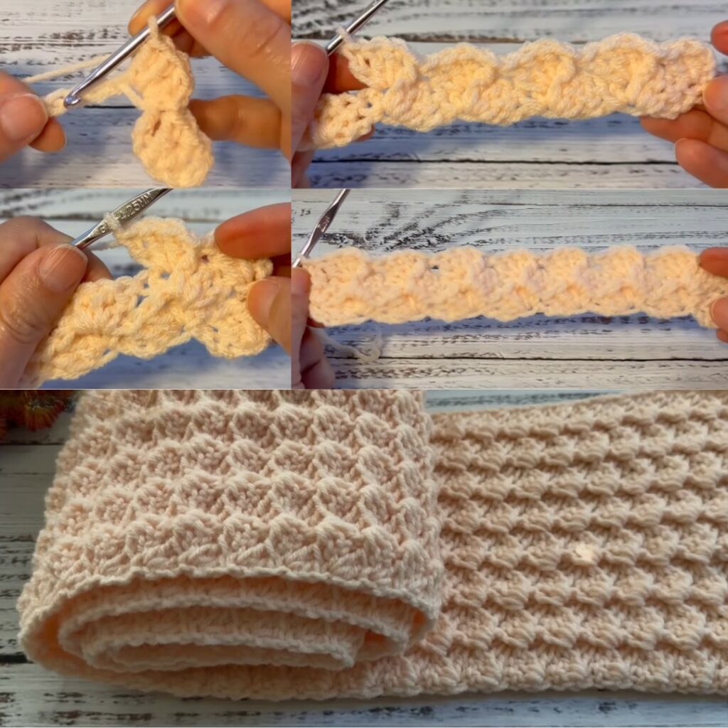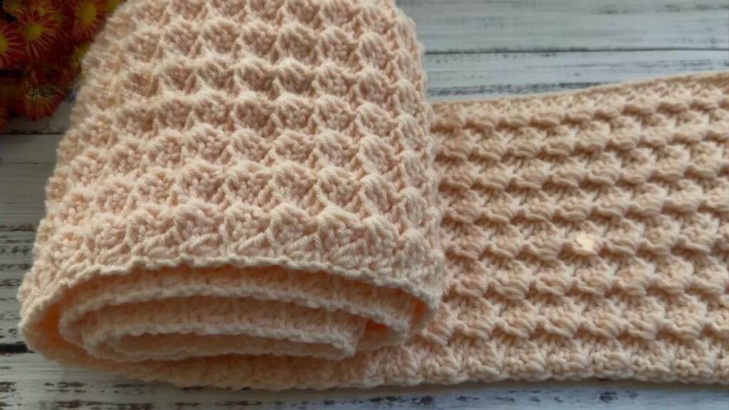 The scarf uses a one-row repeat pattern, meaning after the foundation row you repeat the same stitch row over and over until the desired length. The simplicity makes it ideal for beginners or relaxed crocheting.