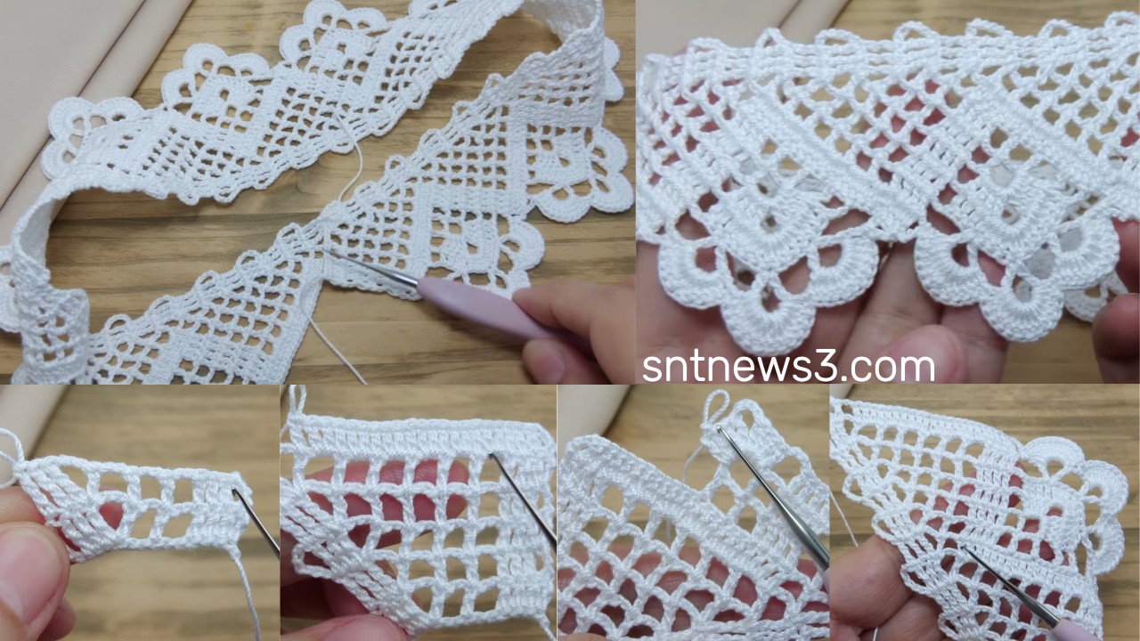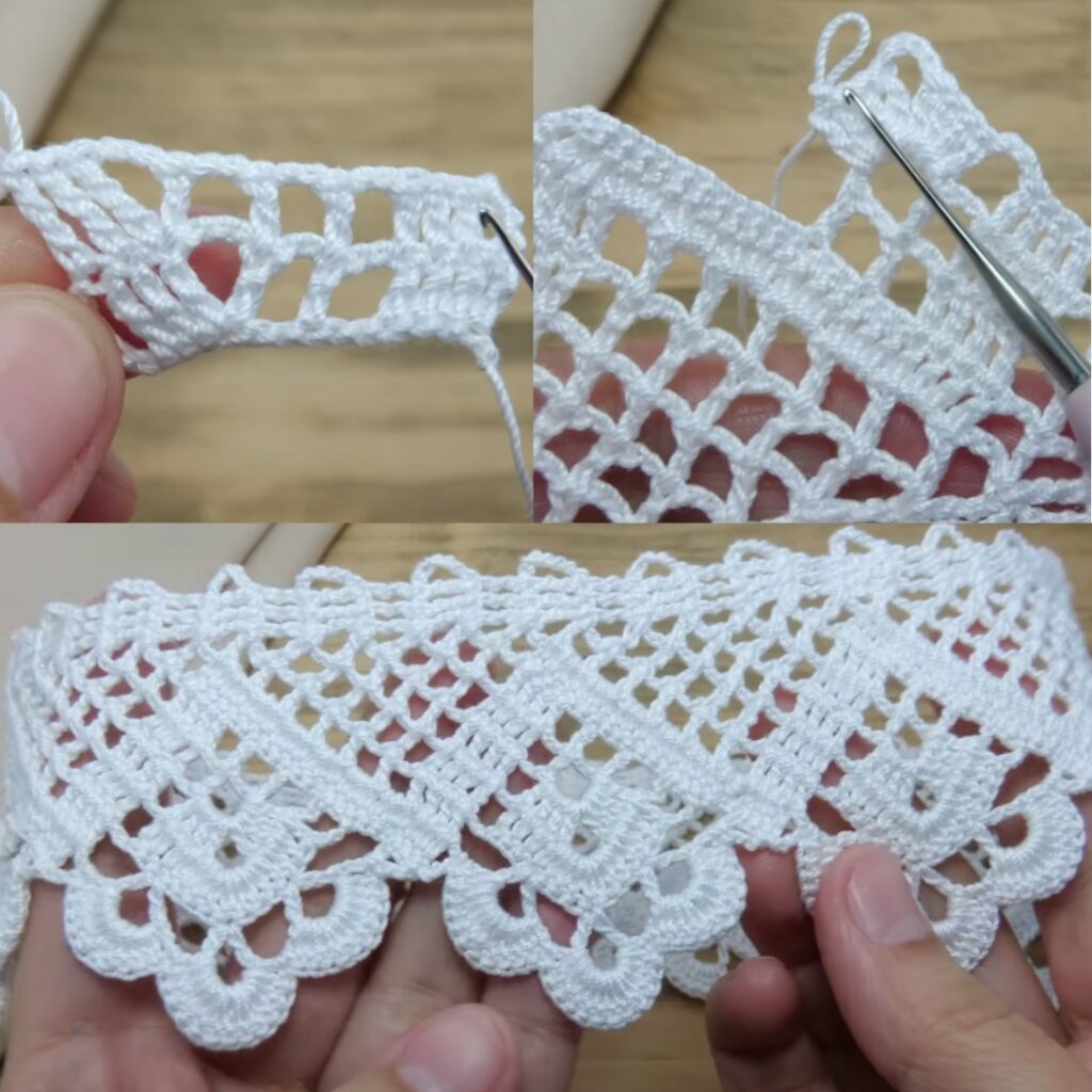 - Use fine thread and small hook for very delicate lace — great for collars, trim; use thicker yarn and bigger hook for decorative border for blanket or cover.