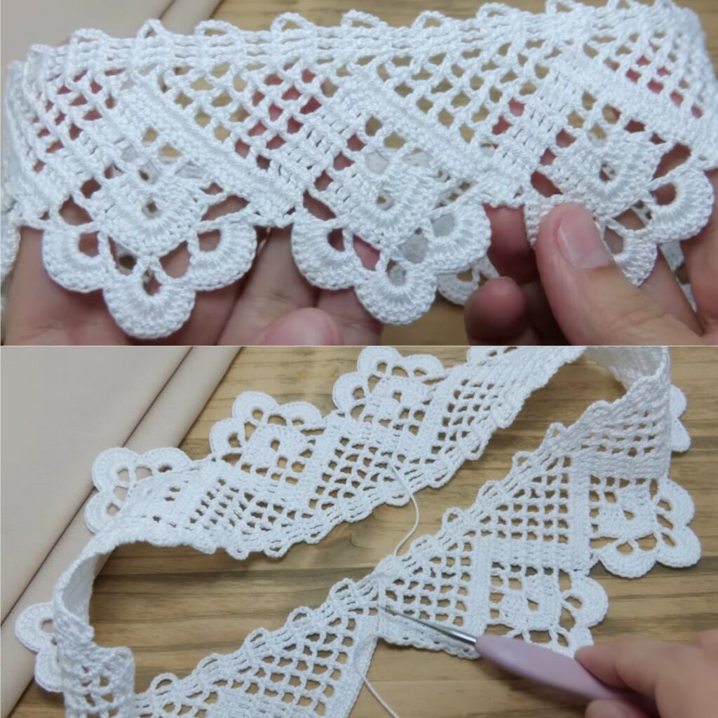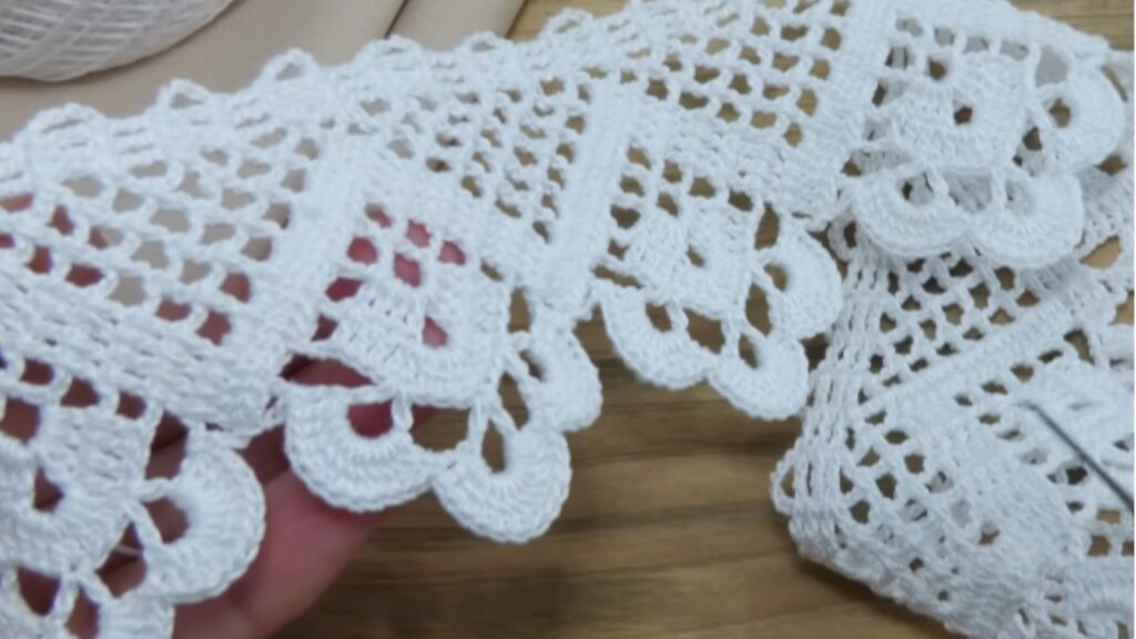 The lace ribbon (кайма) is worked in multiple rows, building up a narrow strip with a repeating motif of chain loops and shell/fan clusters. Because it’s a ribbon, you work one row after another, turning each time, and can adapt the width by repeating more or fewer motif rows.