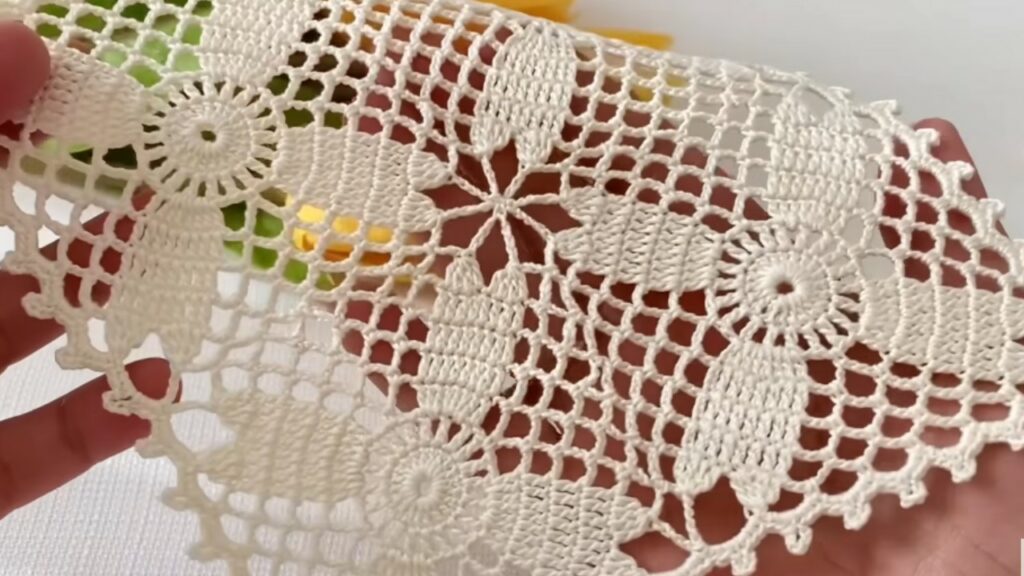 Each motif begins from the center and expands into delicate petals surrounded by lacy arches.