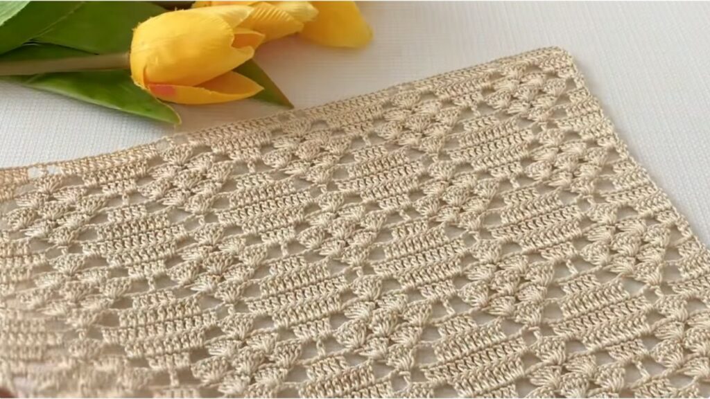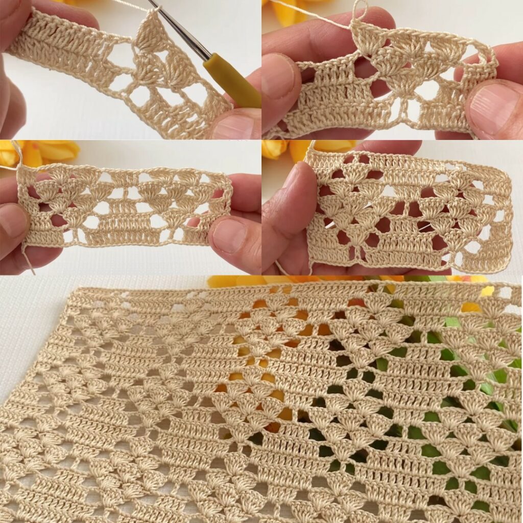 - Repeat: 2 dc — shell — 2 dc — shell across