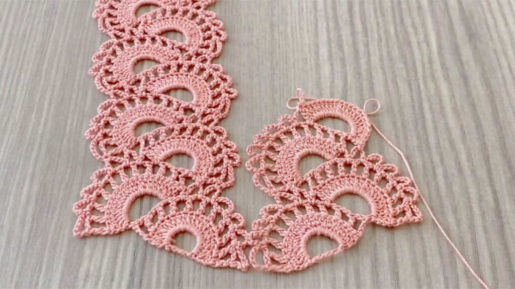 - In the first ch-3 arch: dc 2, ch 2, dc 3 → first shell made.