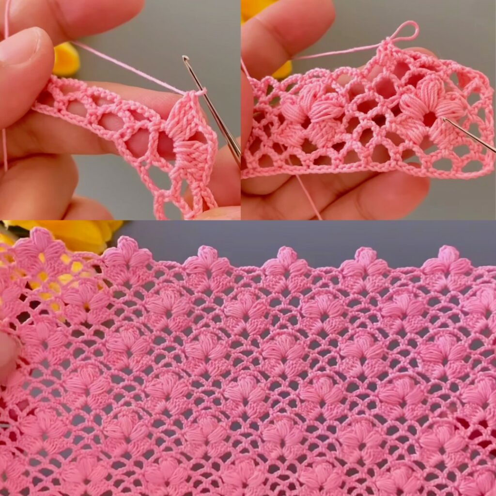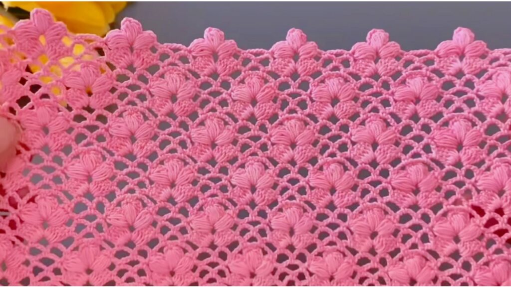 ch4 → sc in center of shell → ch4 → dc in next 2 dc