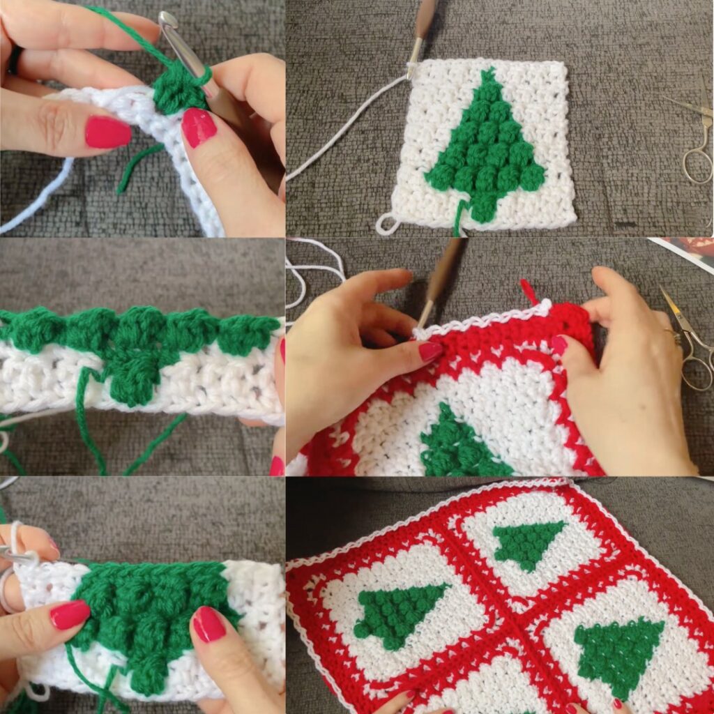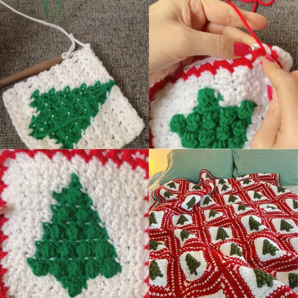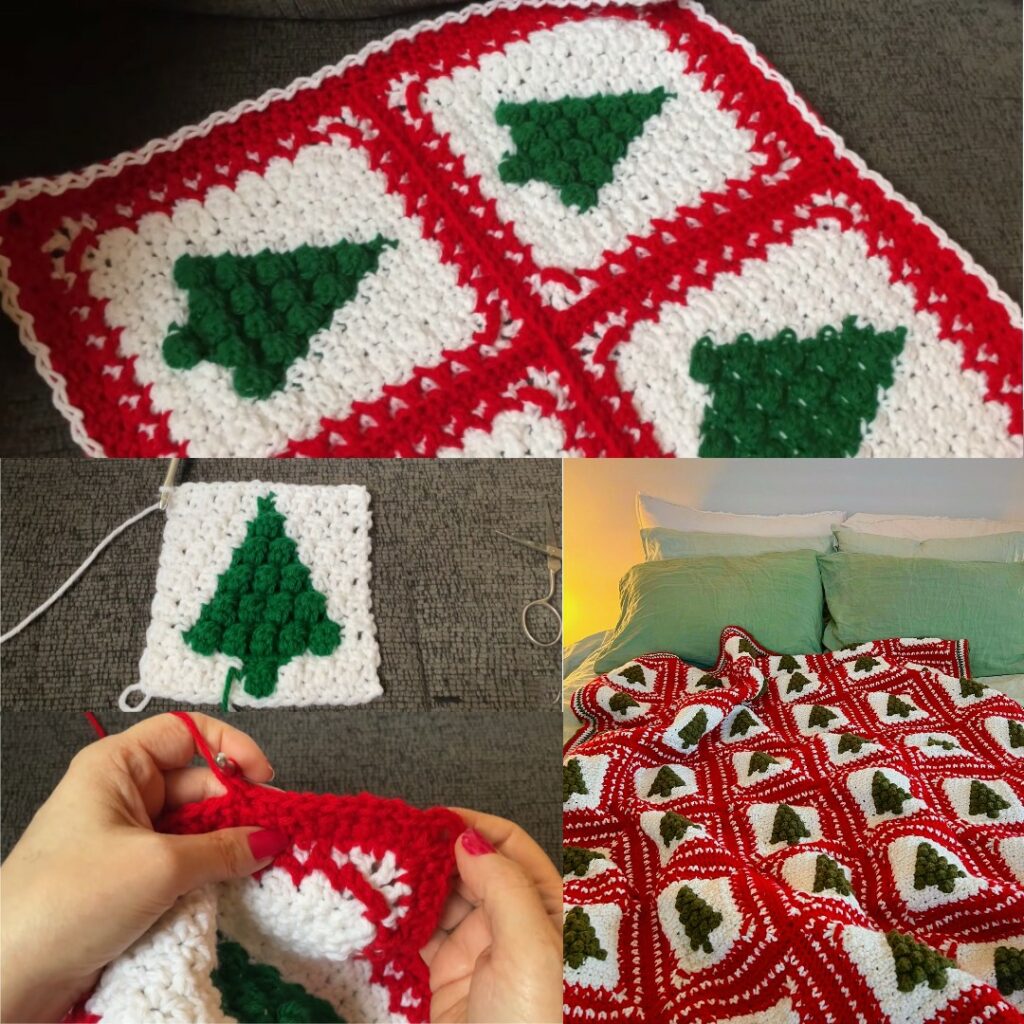 A cozy throw blanket built from granny squares with a small crocheted Christmas tree appliqué sewn to the center of each square. Squares are joined into a rectangle and finished with a lacy scallop border and little pom-pom or bead stars.