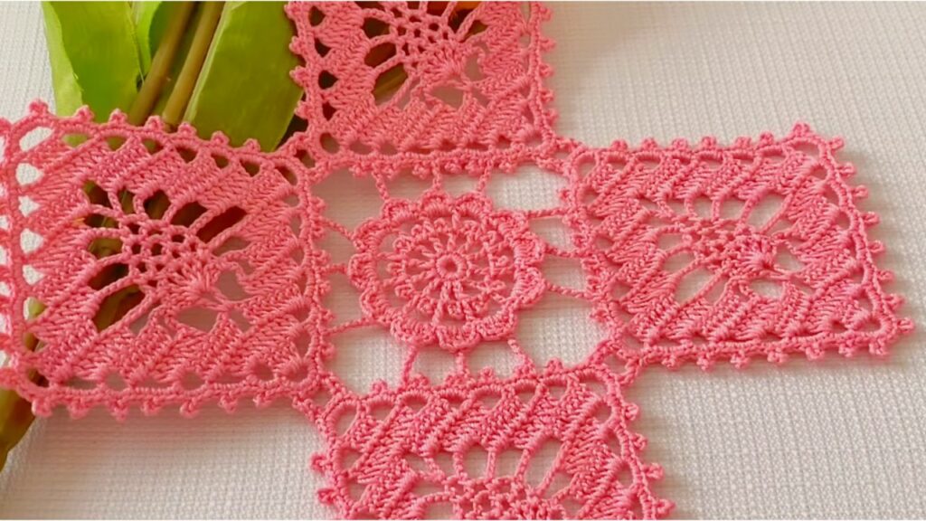 - Join motifs as you go in rows; finish both short ends with a scalloped border for a neat table finish.
