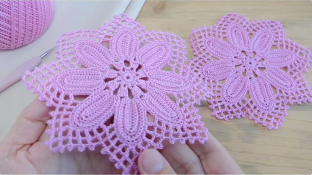 - After joining all motifs, add a border: sc round to even edge, then one or two rounds of shell/scallop as desired.